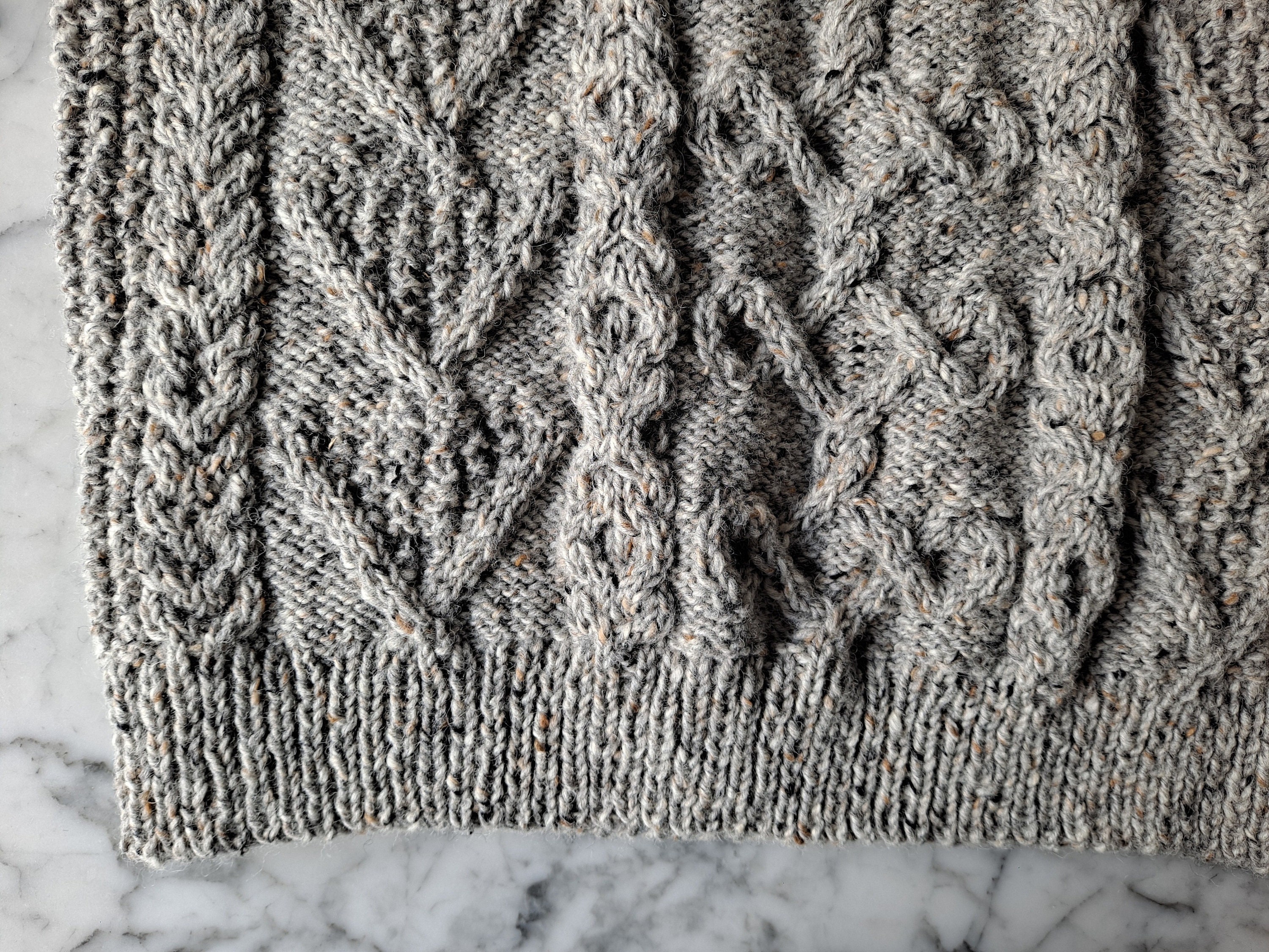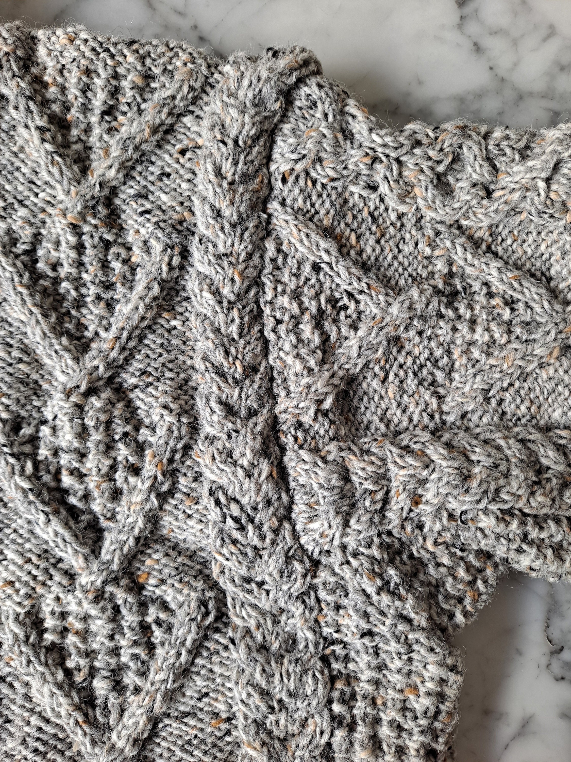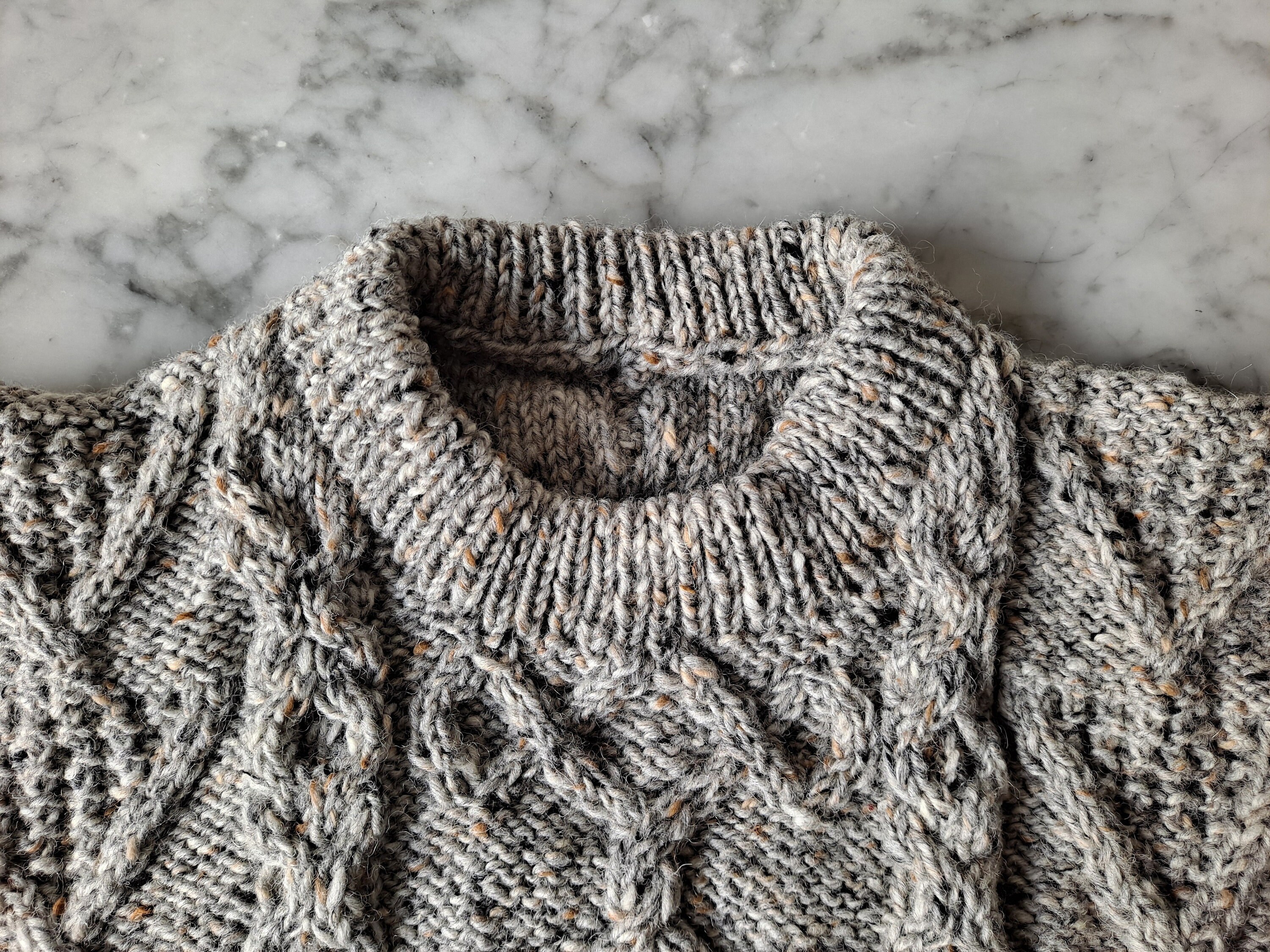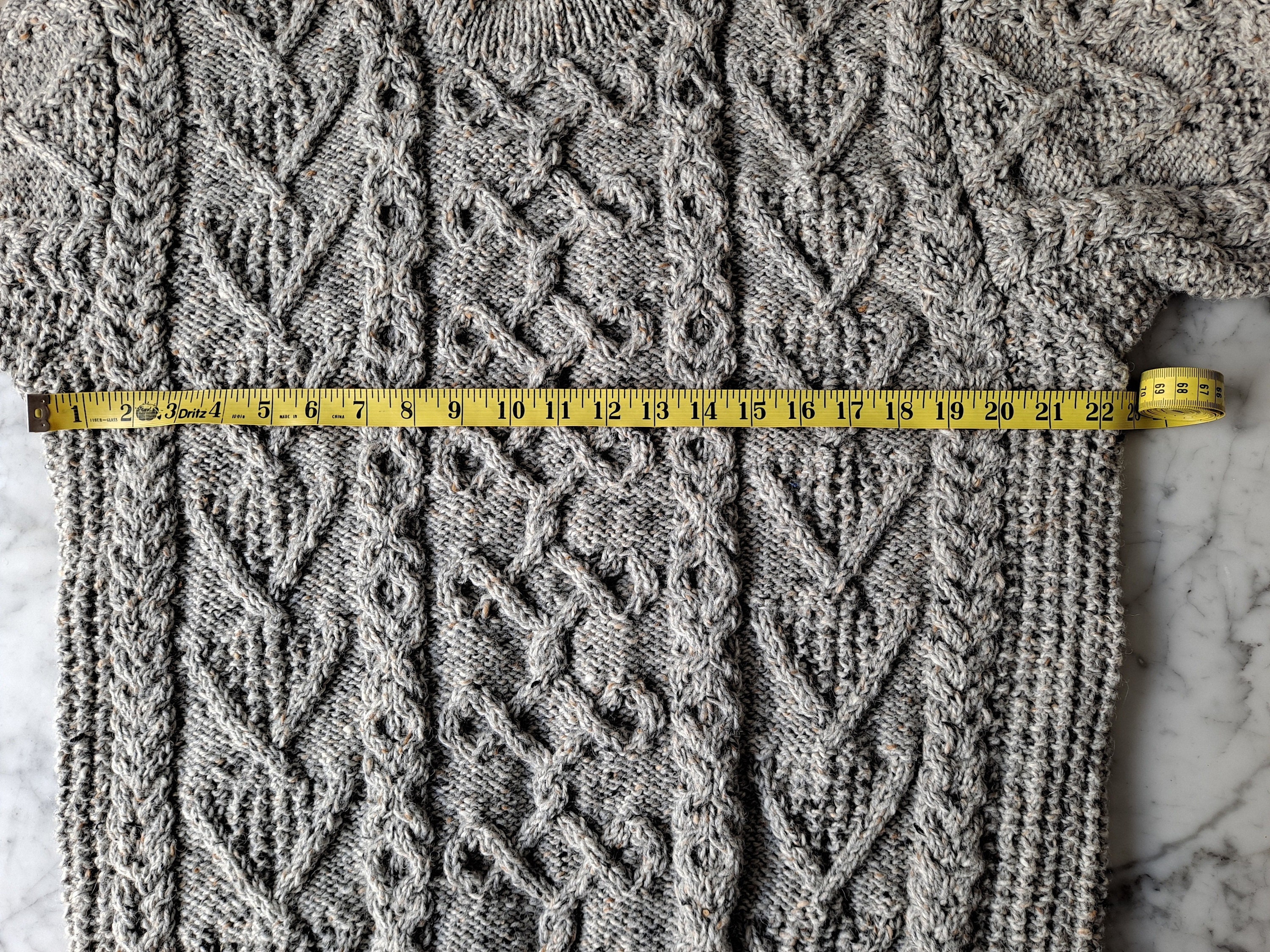 This sweater has a unique design, as each jumper she creates is a one of a kind item. It is knit in Studio Donegal Aran Tweed pure wool, which is wonderfully warm and hardwearing. It is a classic style of Aran, timeless and enduring. The colour is a lovely marled light grey, with some coloured flecks of dark grey, white and beige through it. Here is a link to the shade card of the yarn, which gives you another attempt to capture the colour other than my own! https://donegalyarns.com/products/aran-tweed/ (shade 2017)