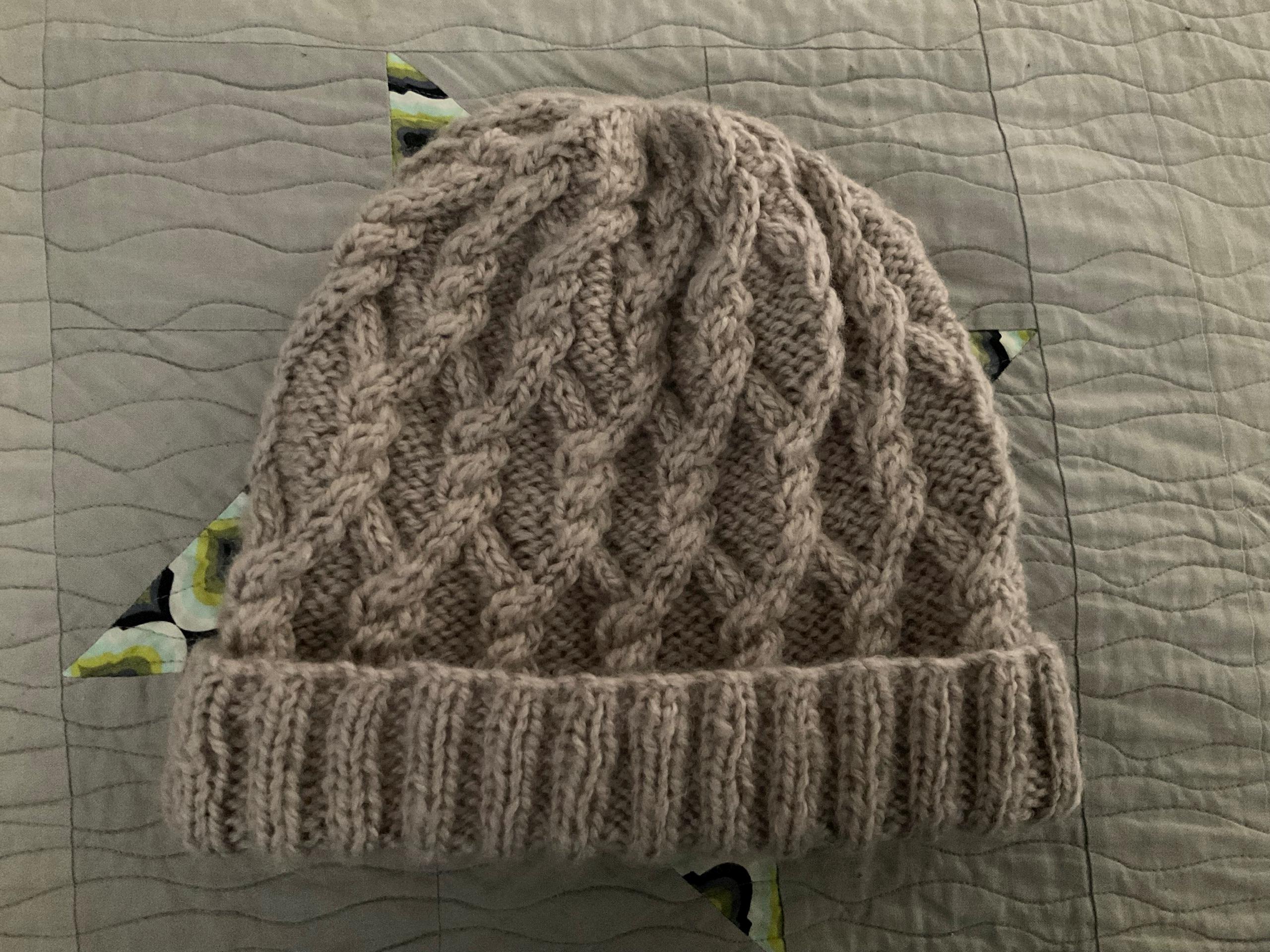 I throughly enjoyed knitting this beautiful pattern. I am an Aussie so utilising my stash I knitted the beanie in Heirloom Merino Magic (white) 10ply on 4.5mm needles (circular for the brim and hat and 4dpn for the decreasing) Each 50g ball has 85m and hence I have a few metres from 2 balls despite doing a double brim. Very quick knit. If you are not a confident knitter but would like to knit a hat with cables this very detailed pattern is the one for you. Janice Dunning Tues 20th August 2024