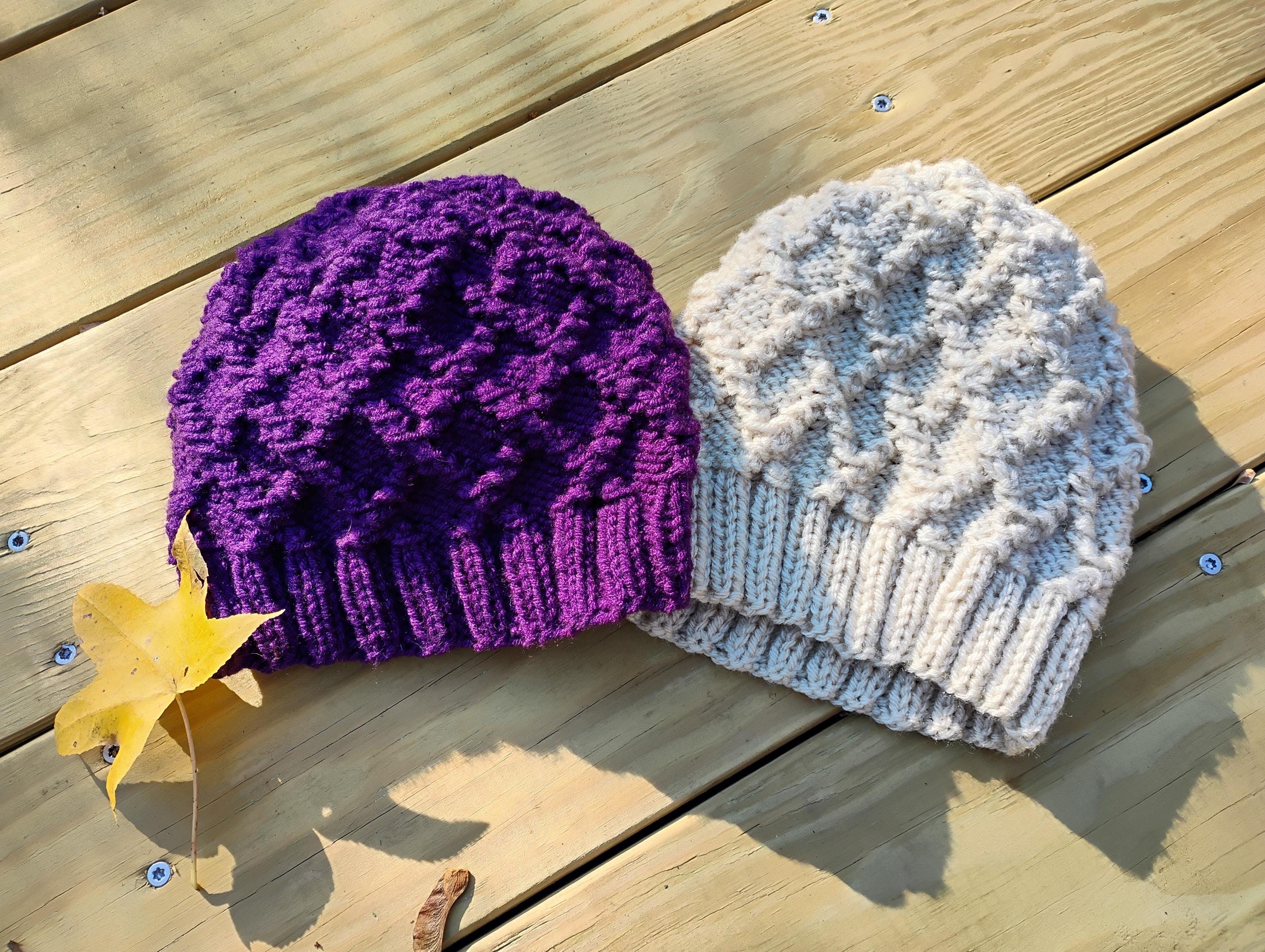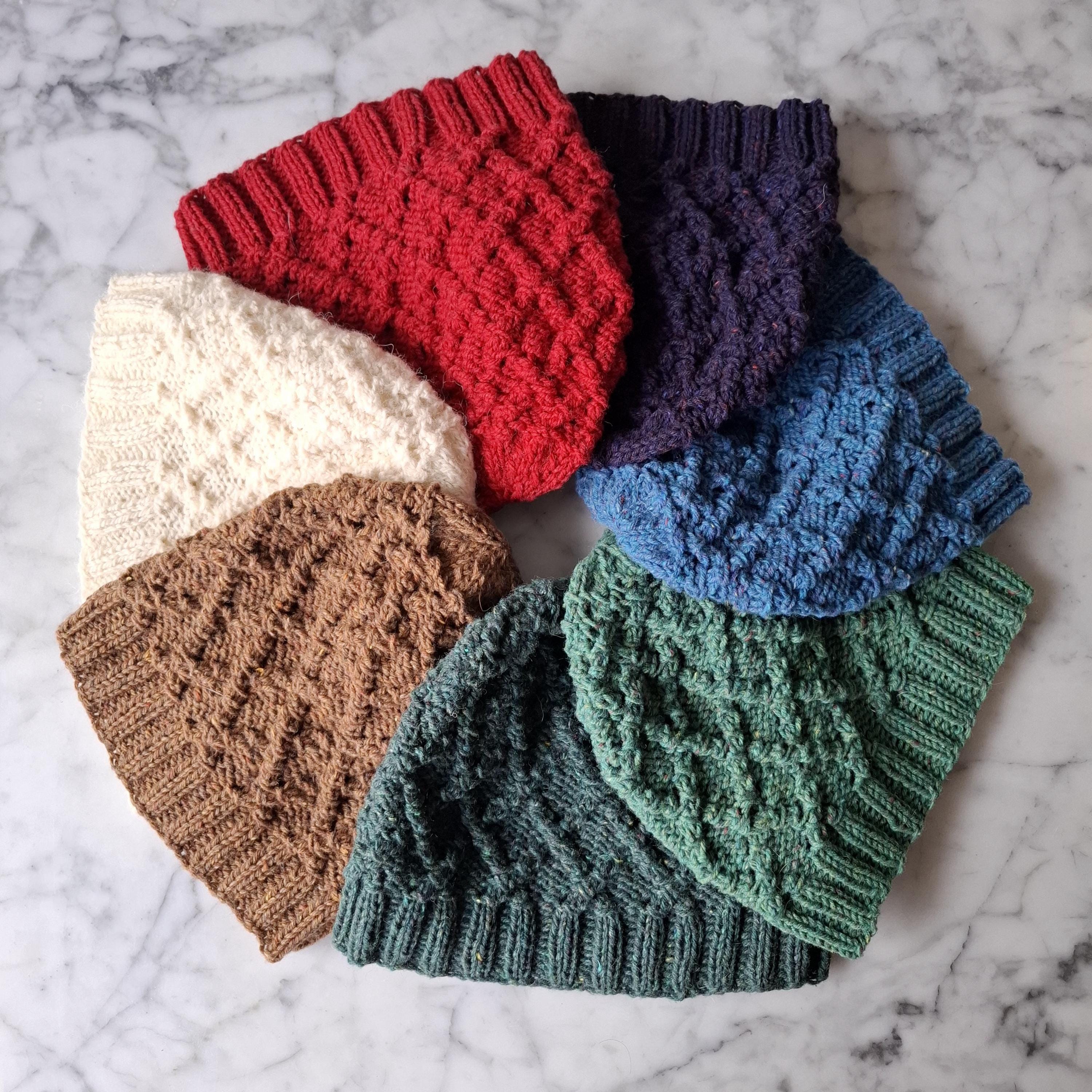 The pictured hats were knit in Aran or worsted weight wool, with each hat using one skein of 100g yarn. Yardage of 130 metres/140 yards is required, but if you choose to knit the folded brim, more yardage will be required. Bear in mind that the wrapping of stitches uses some more yarn than a regular cable, and if necessary, allow a little more yarn than you usually would for a beanie hat.