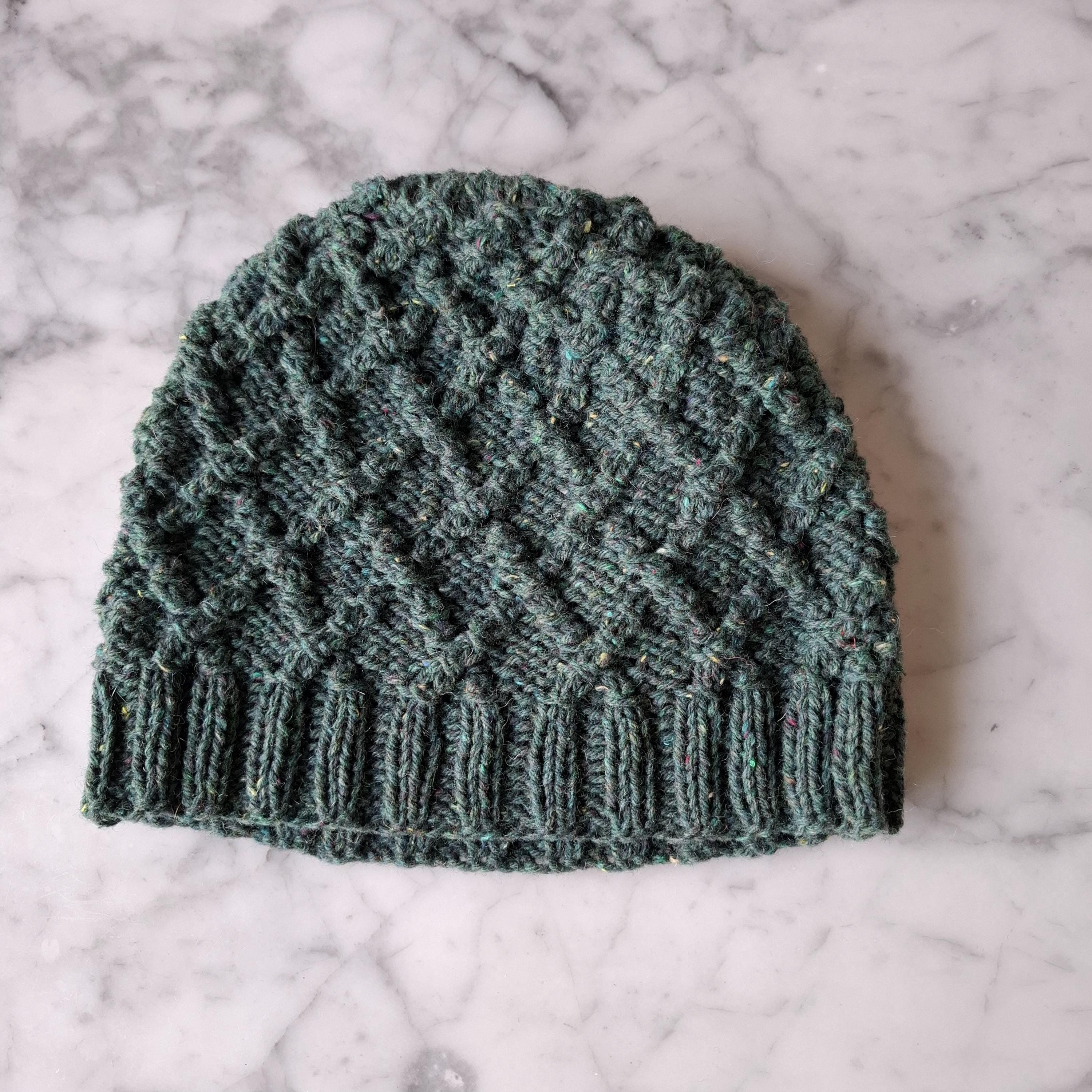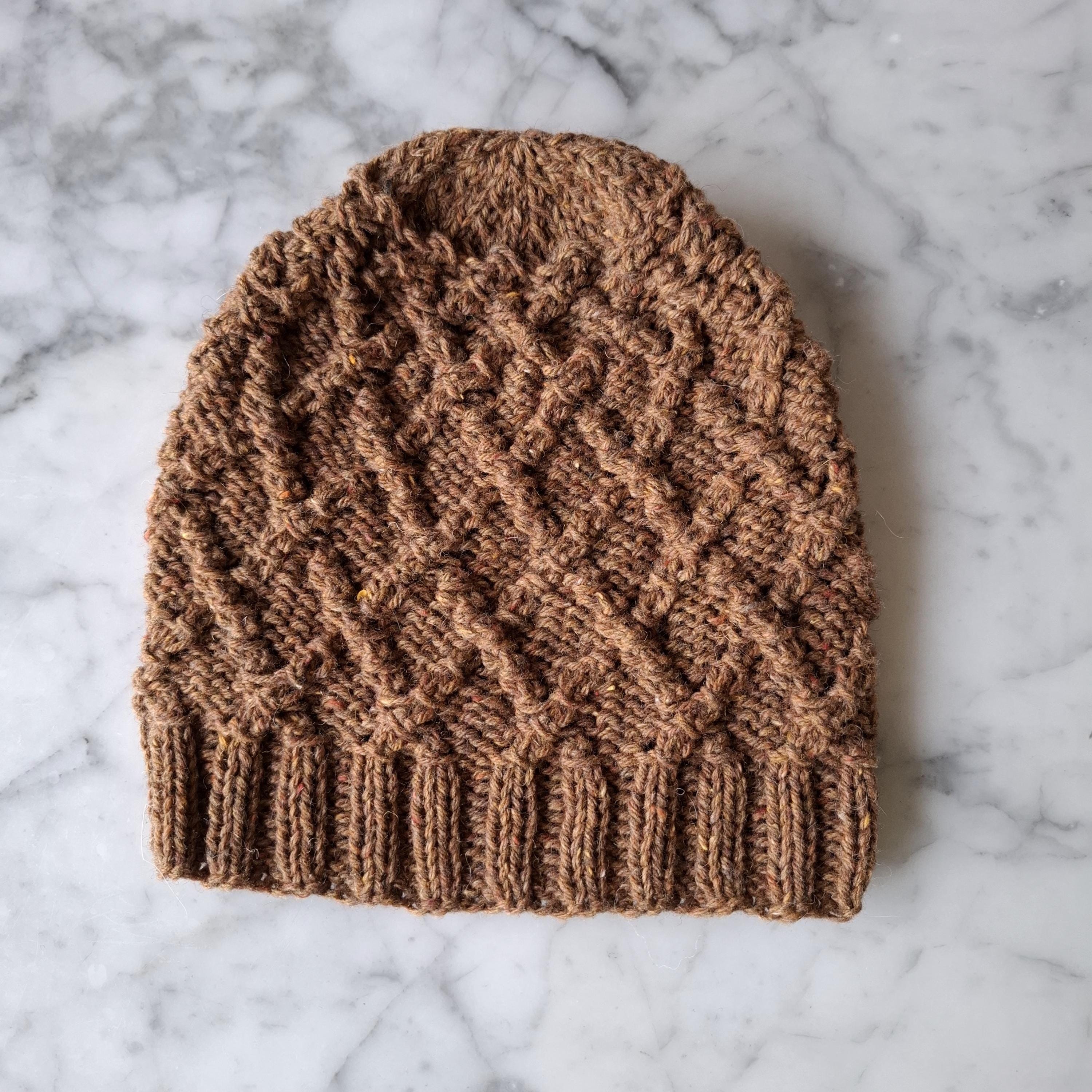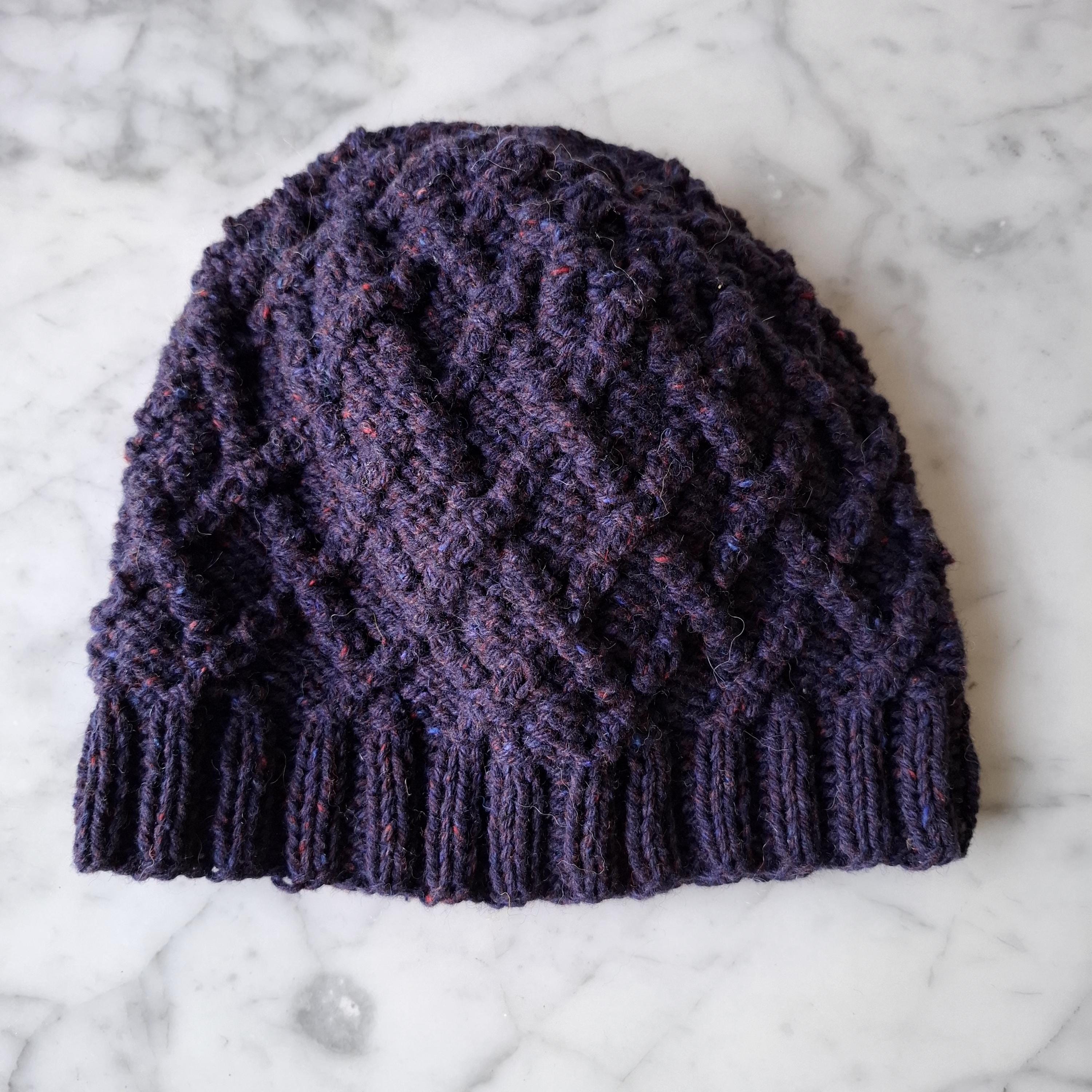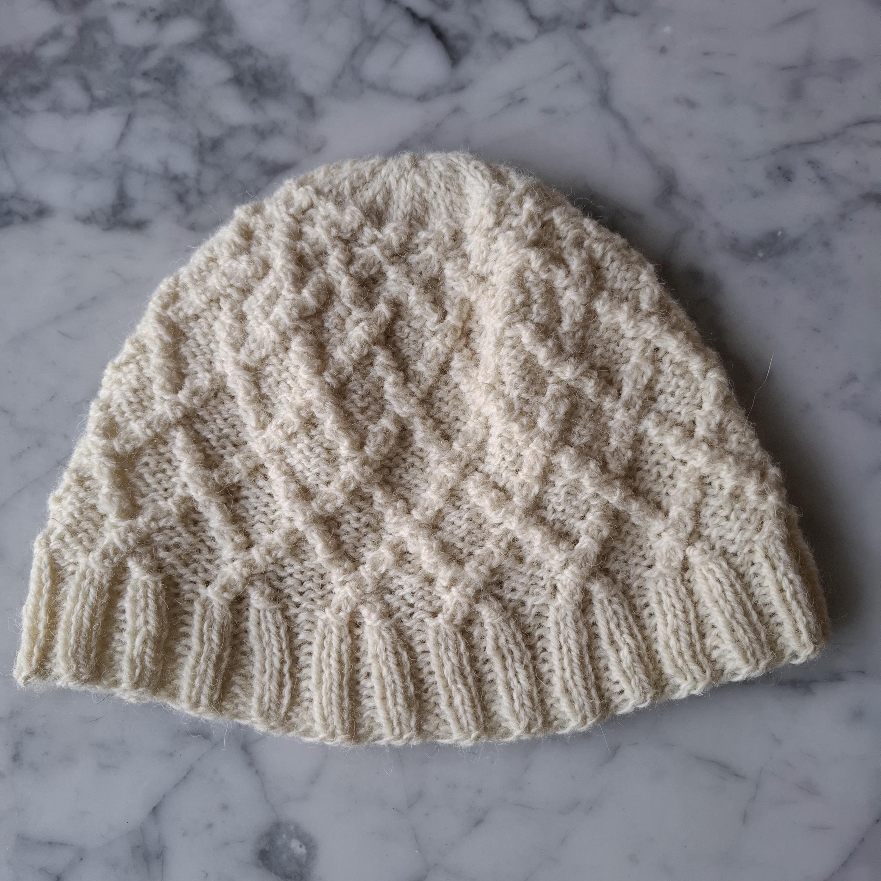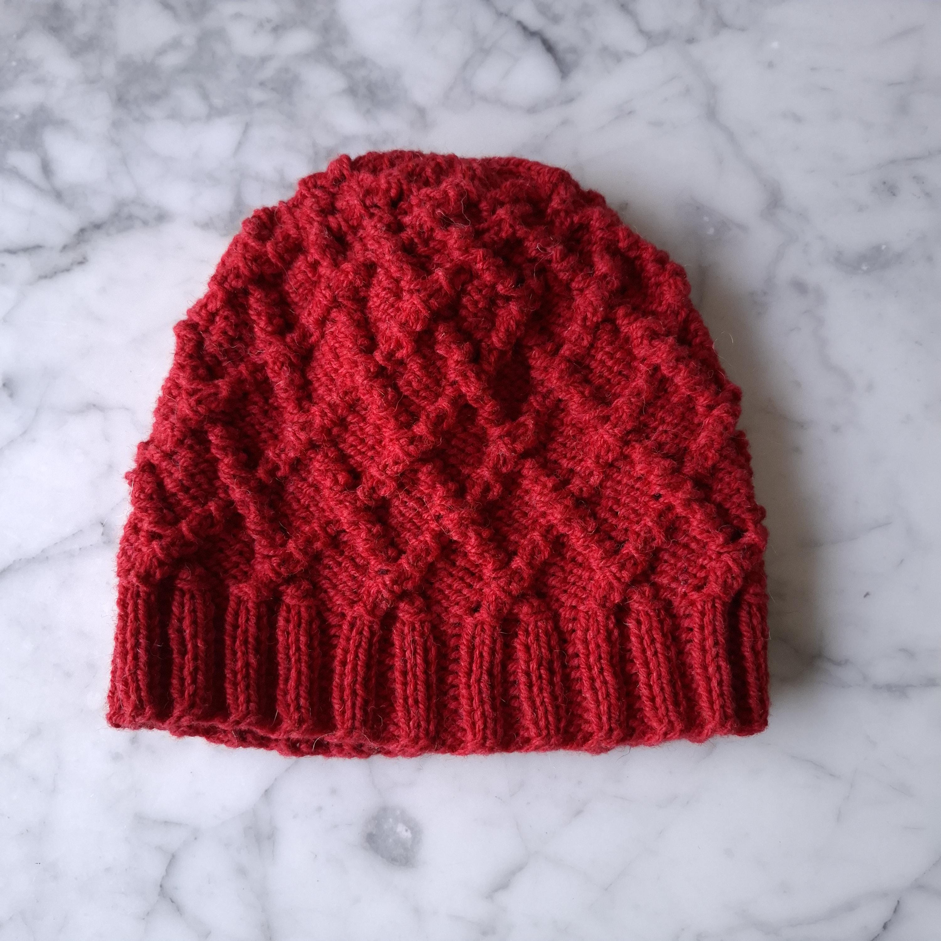 For this pattern, I have adapted the motif to work for knitting in the round, on circular needles. The finished hat is seamless, with the cables flowing from brim to crown without interruption. The cable created is a very textured one, featuring a wrapped garter stitch cable. It is not difficult to work, as it does not occur on the same row as any travelling stitches. The cabling pattern is not overly complicated, but there is some adjusting of the stitch marker to ensure that the cabling pattern stays seamless throughout. I would not suggest this pattern for a beginner to cable knitting, but it would be ideal for an intermediate knitter. One of my testers said: "I've never seen this type of cable before, so it was really exciting for me to do something that felt completely different."