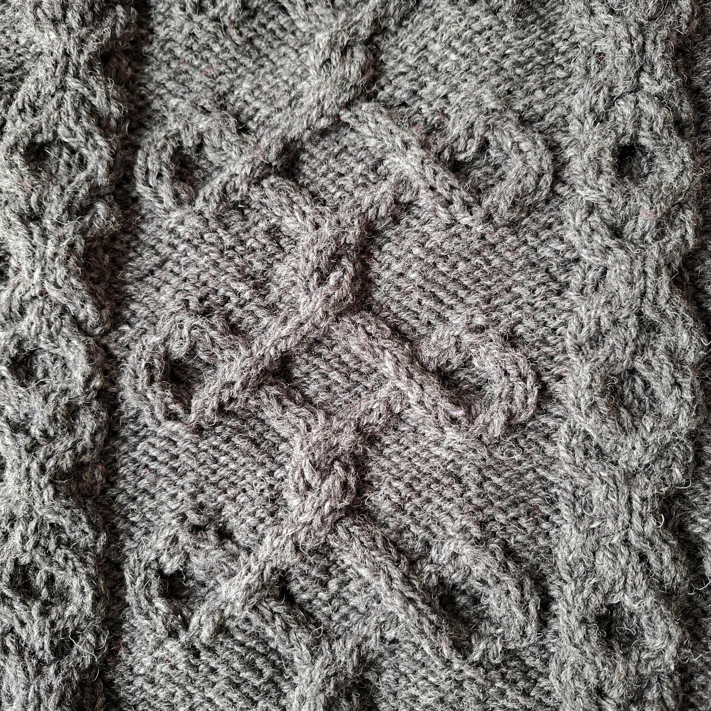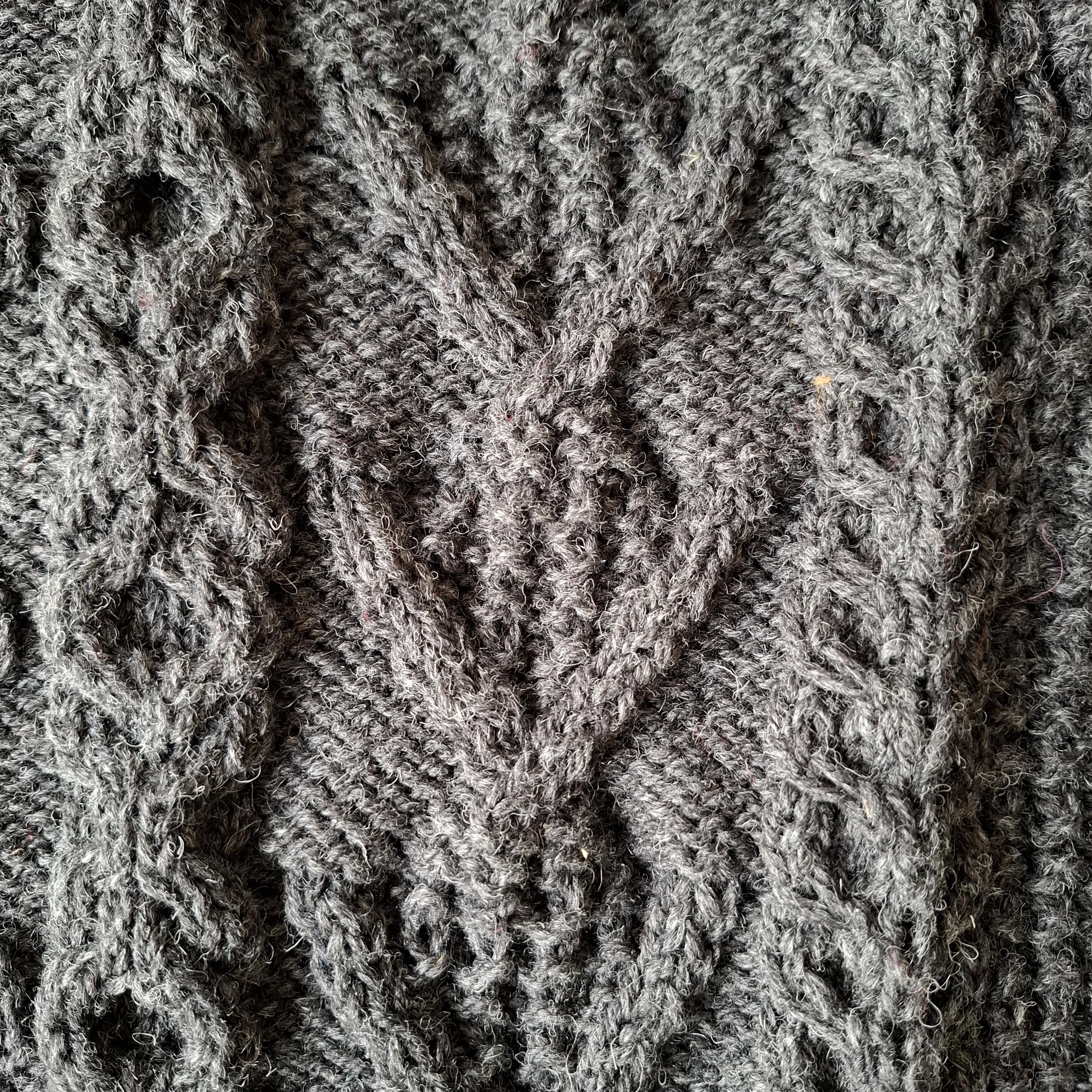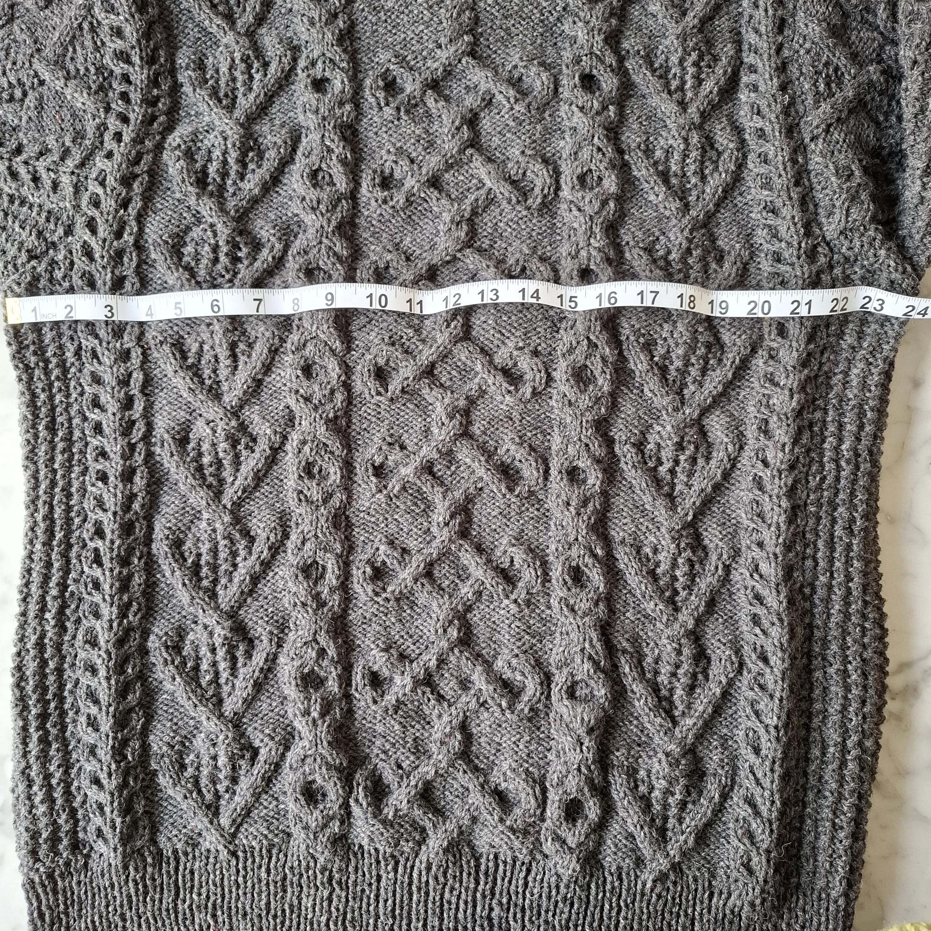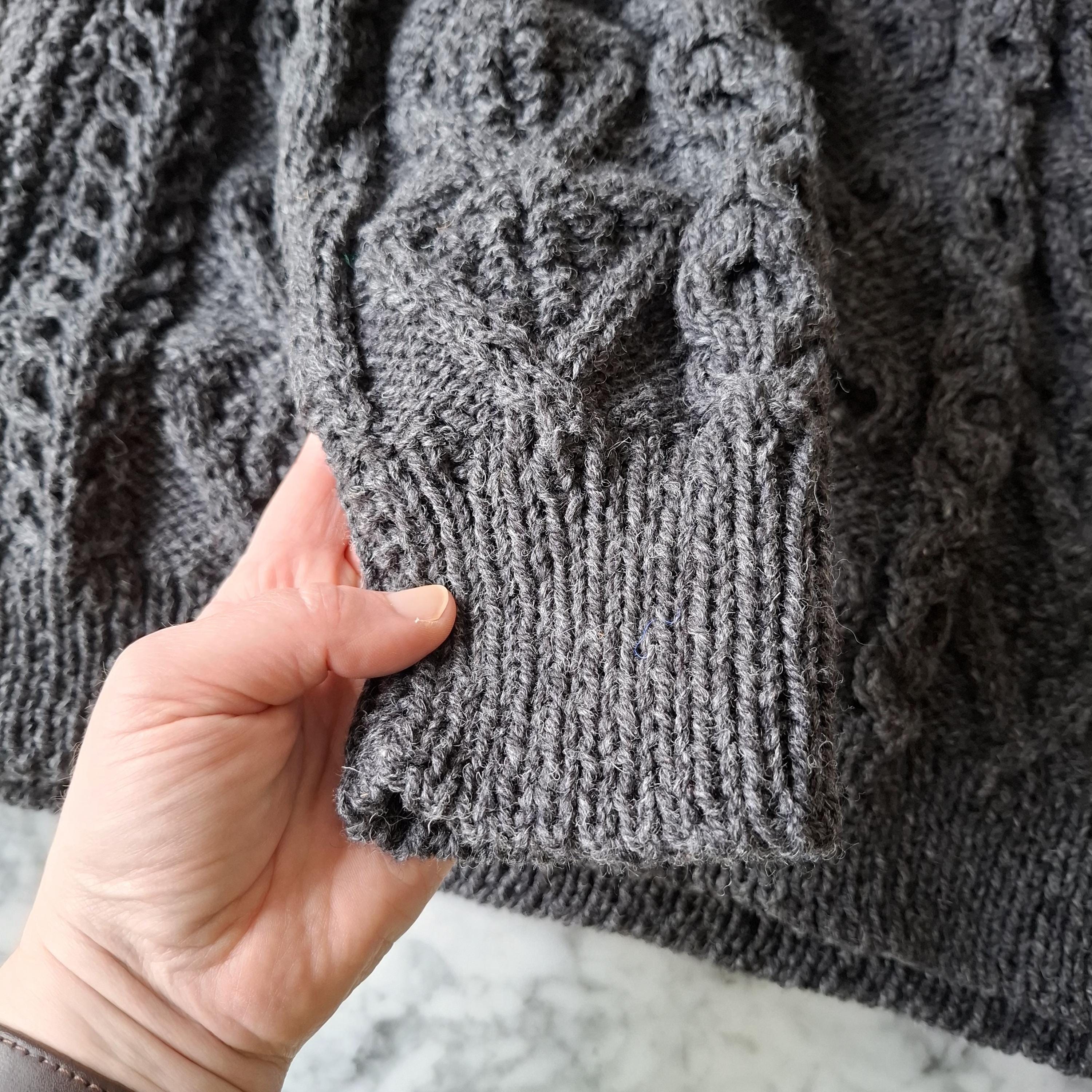 This sweater has a unique design, as each jumper she creates is a one of a kind item. It is knit in Studio Donegal Irish Heather pure wool, which is wonderfully warm and hardwearing. It is a classic style of Aran, timeless and enduring. The colour is a charcoal grey, which is a great neutral colour, bound to co-ordinate with many items already in your wardrobe. *Please note:* It has been difficult to get the colour correct in the photos, since our daylight is very low at this time of year. It is not a light grey colour, but quite a dark grey which is closer to black than white. Here is a link to the shade card of the yarn, which gives you another attempt to capture the colour other than my own: https://donegalyarns.com/irish-heather/ (The shade number is 8009).