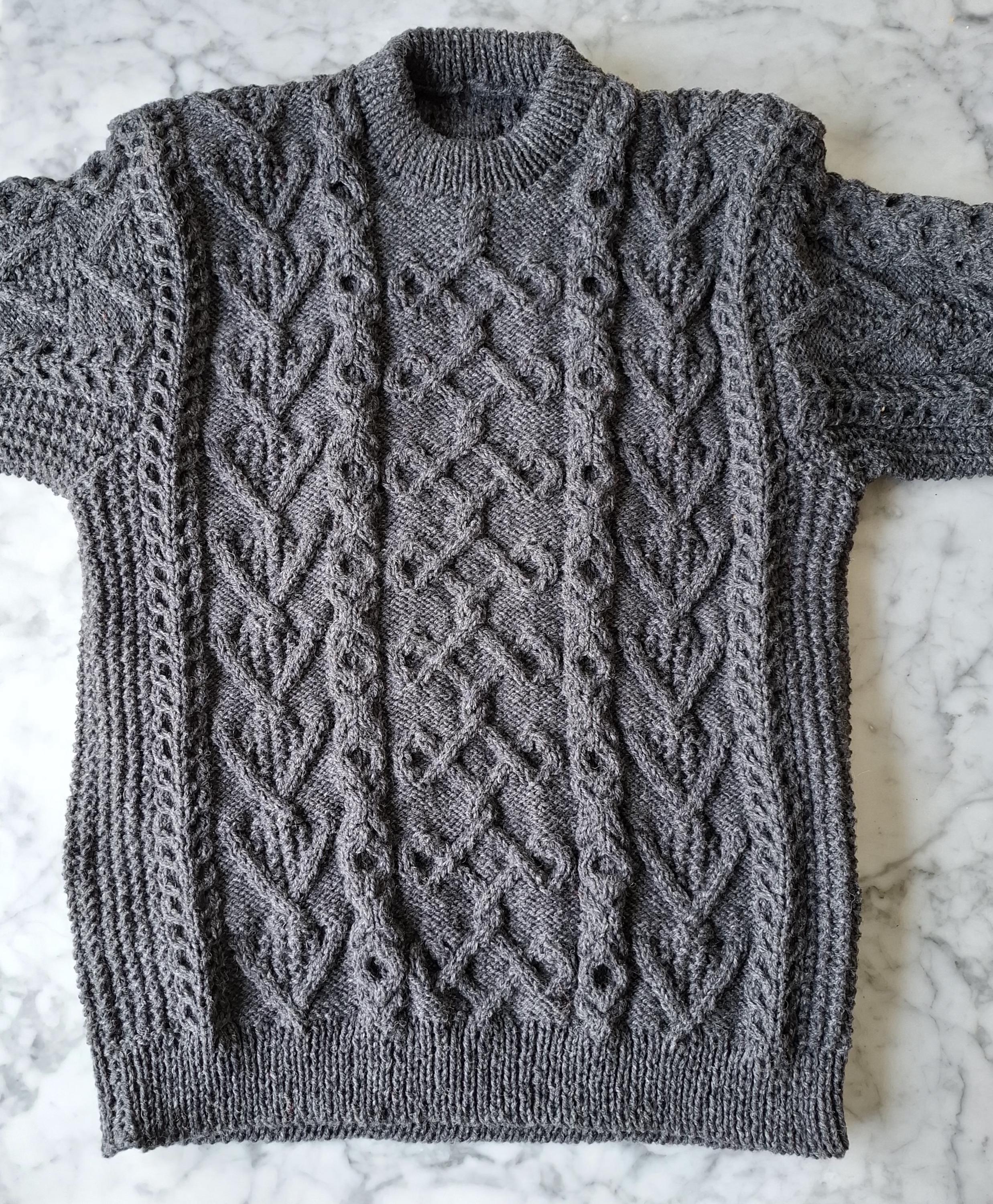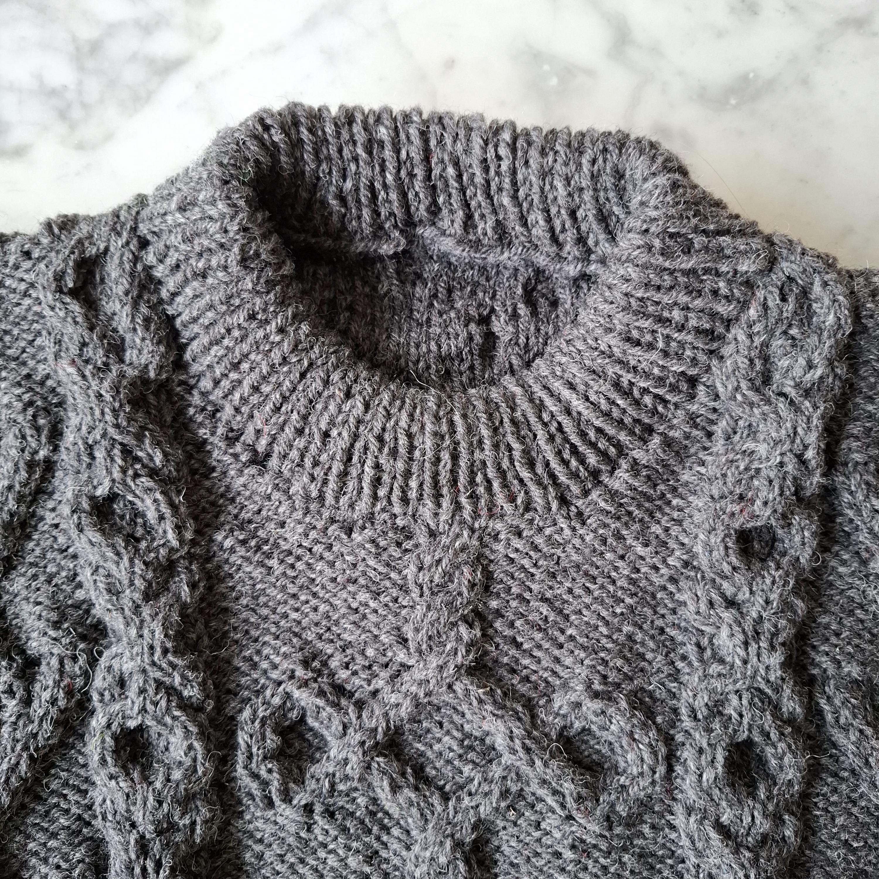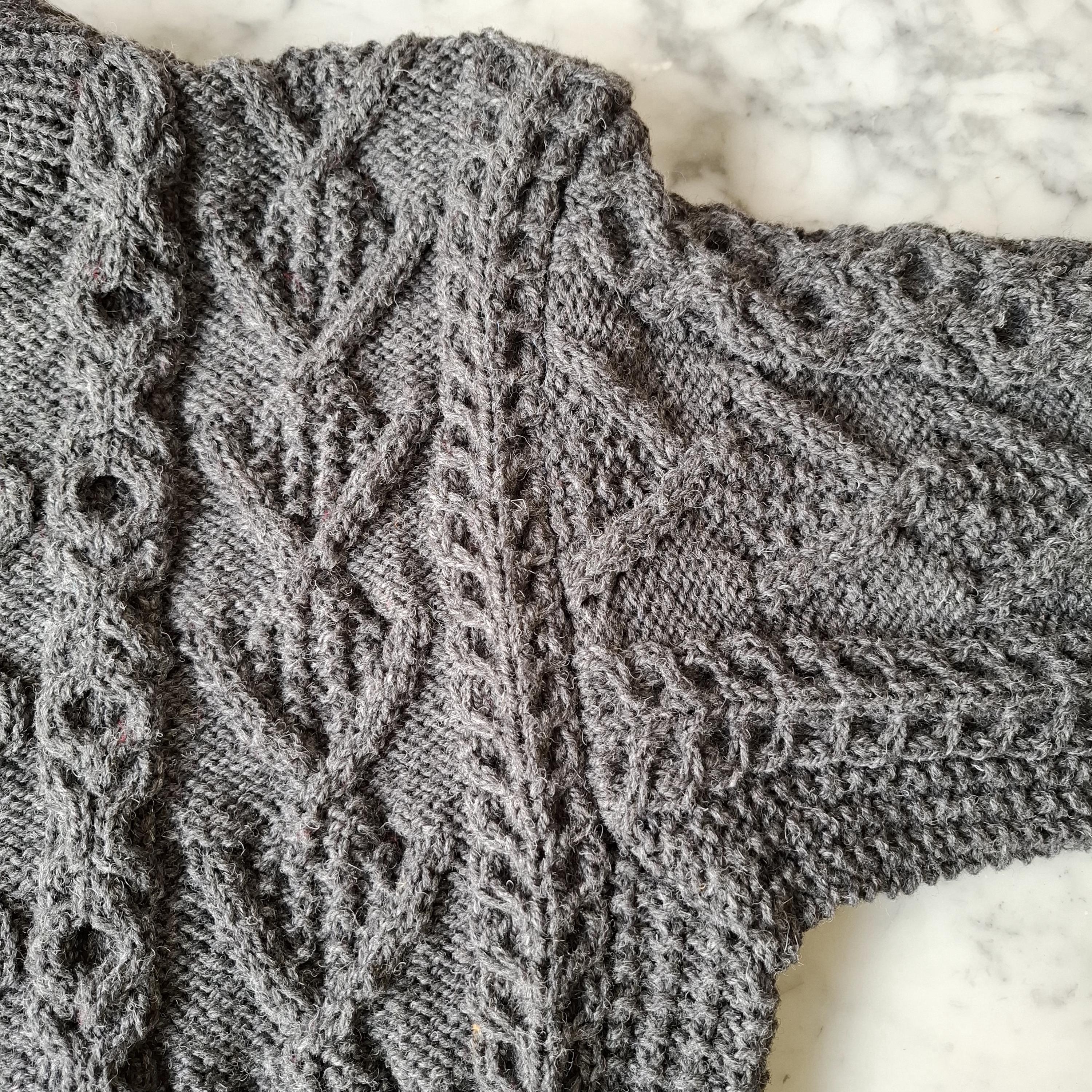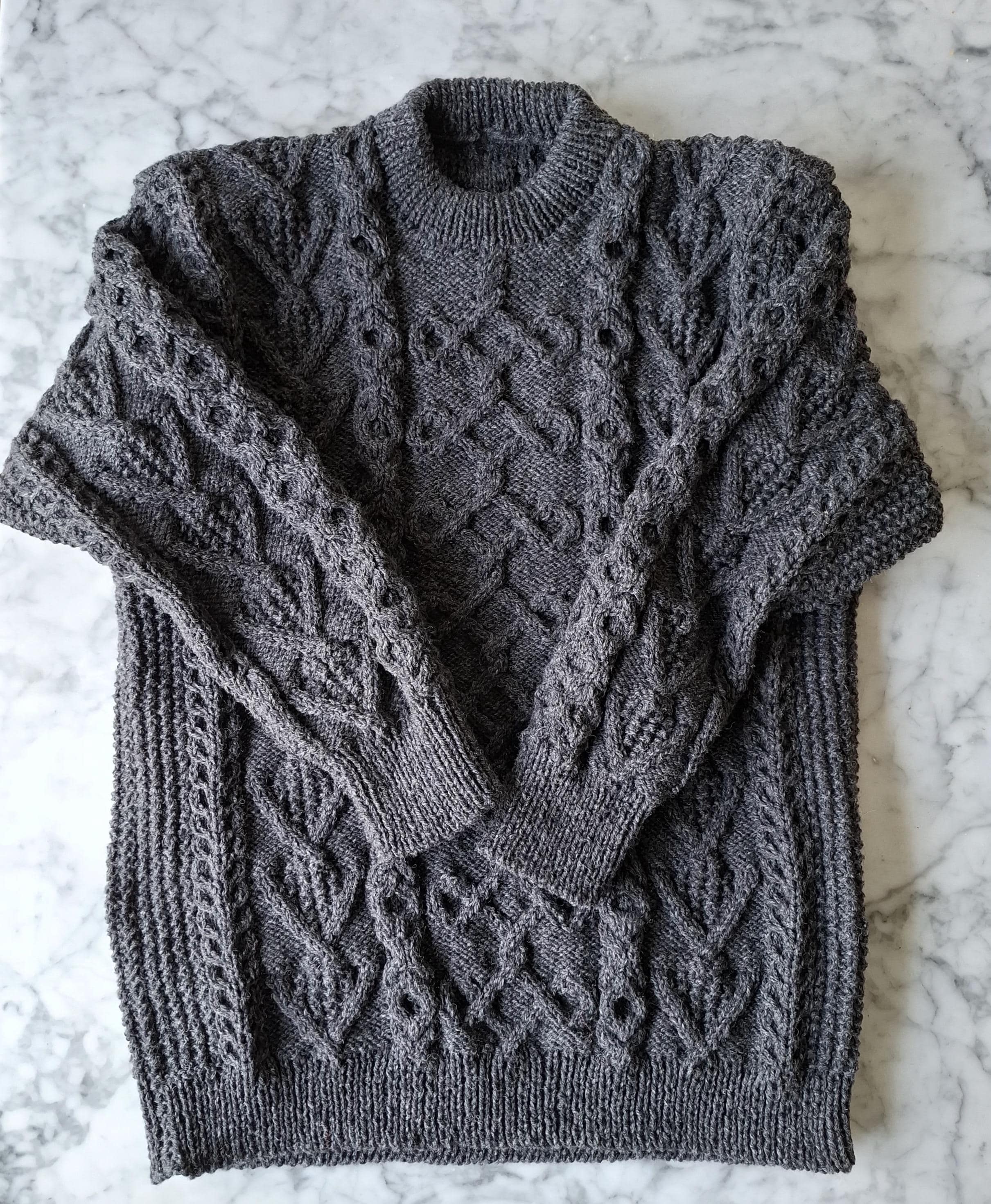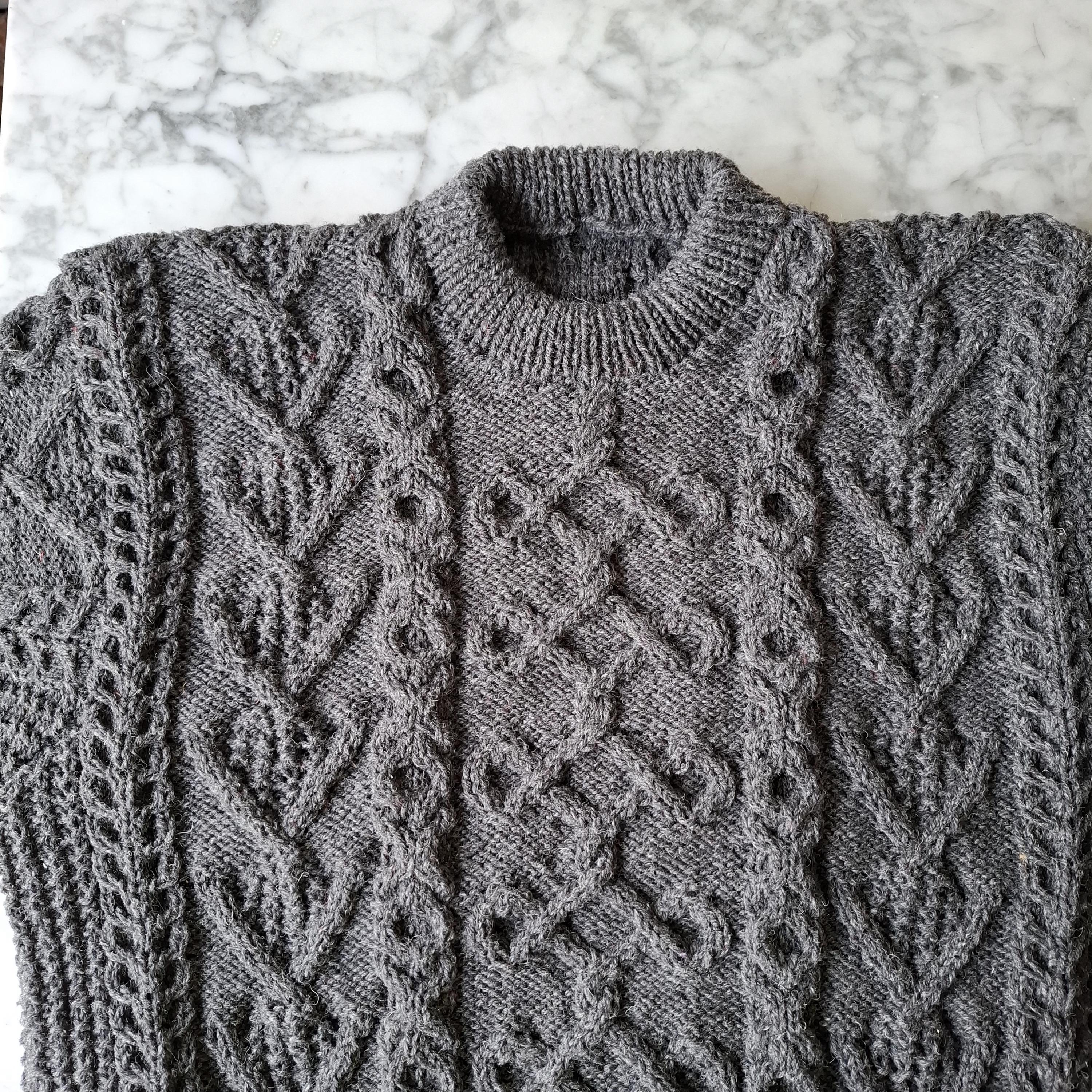This sweater has a unique design, as each jumper she creates is a one of a kind item. It is knit in Studio Donegal Irish Heather pure wool, which is wonderfully warm and hardwearing. It is a classic style of Aran, timeless and enduring. The colour is a charcoal grey, which is a great neutral colour, bound to co-ordinate with many items already in your wardrobe. *Please note:* It has been difficult to get the colour correct in the photos, since our daylight is very low at this time of year. It is not a light grey colour, but quite a dark grey which is closer to black than white. Here is a link to the shade card of the yarn, which gives you another attempt to capture the colour other than my own: https://donegalyarns.com/irish-heather/ (The shade number is 8009).