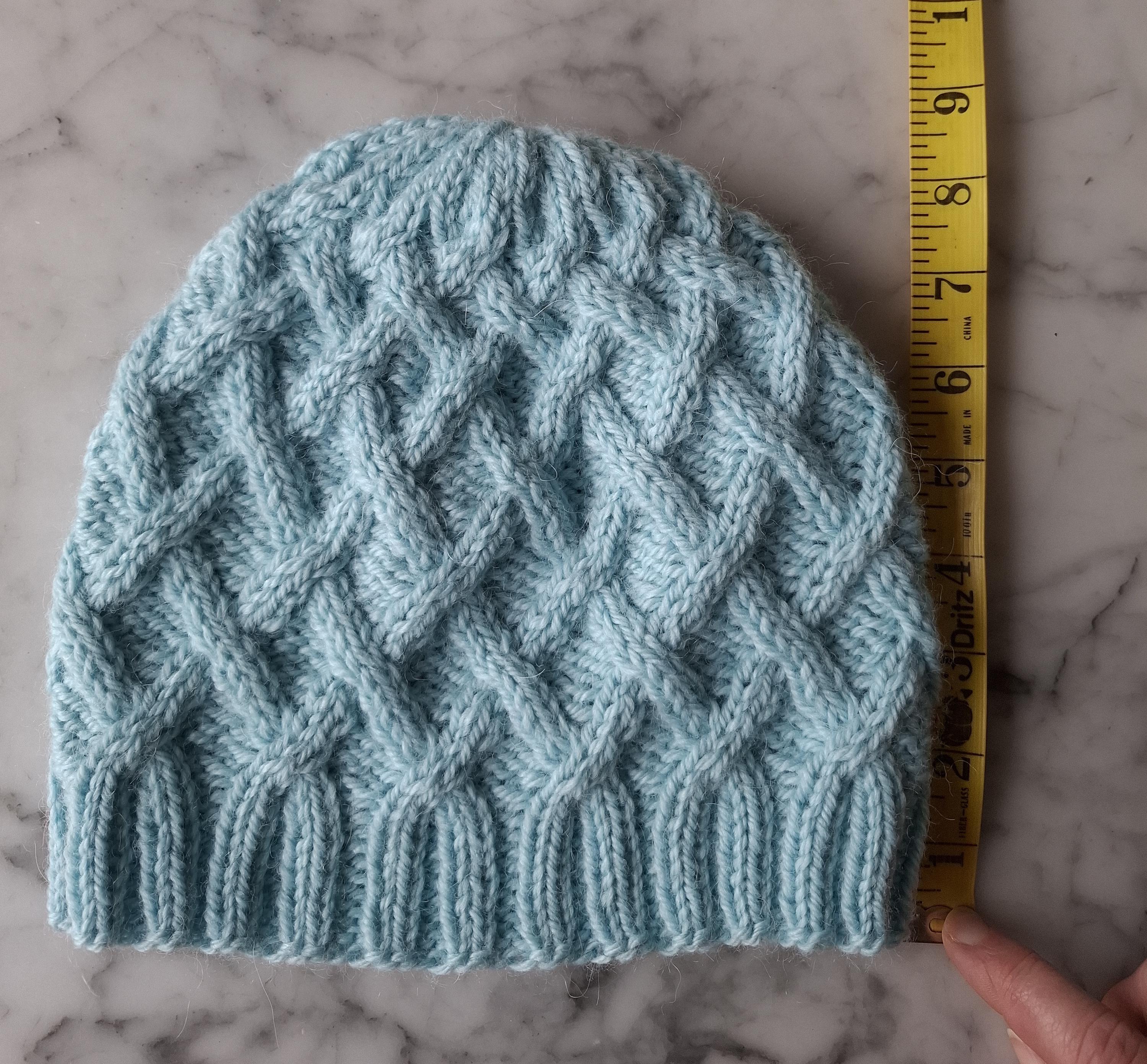 This hat measures around 16 inches/41 cm in circumference (unworn/unstretched) and is a comfortable fit on a head up to 24/25 inches (60-62cm), equivalent to an adult Medium-Large. The hat measures 8 1/2 inches/21.5 cm from brim to crown (on my head, this is long enough to cover my ears).