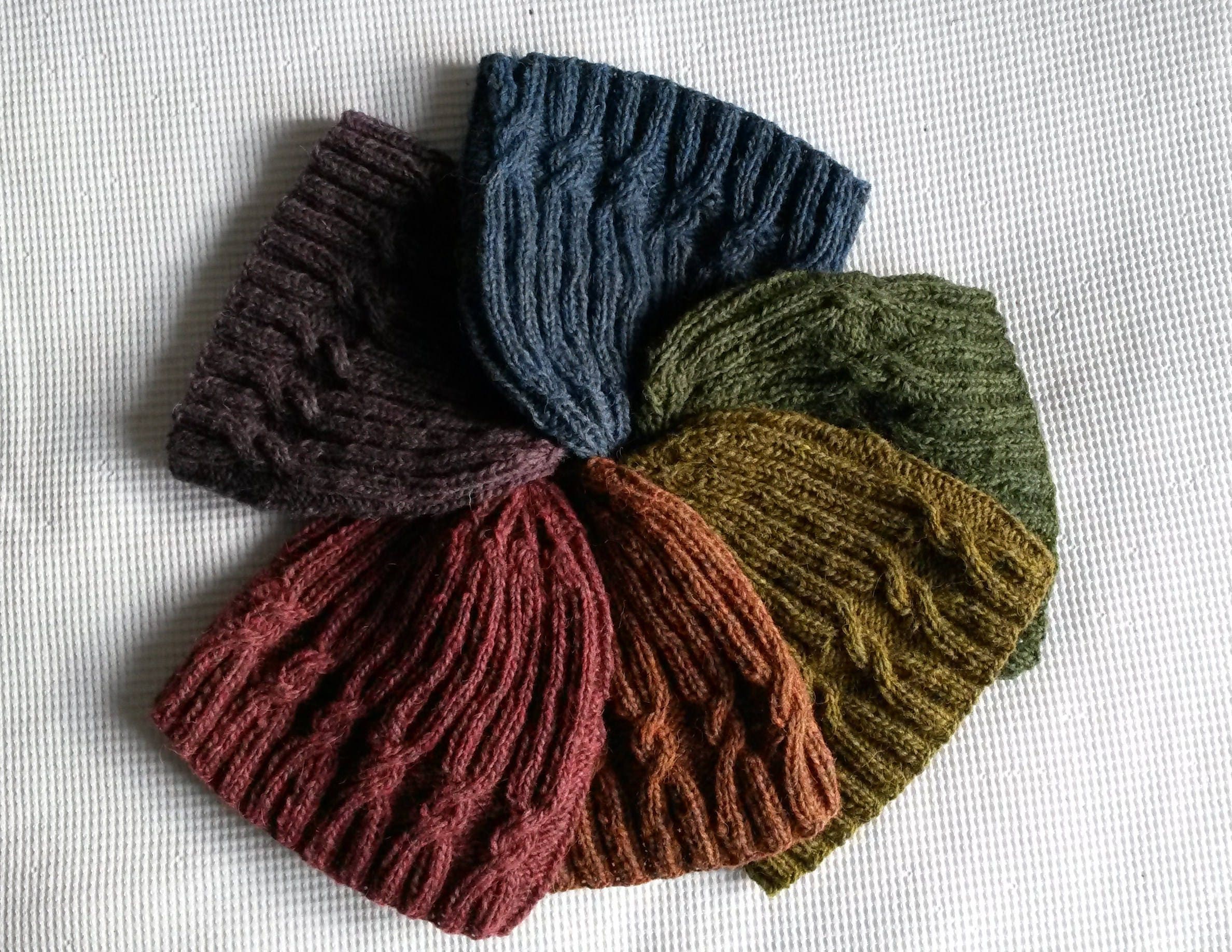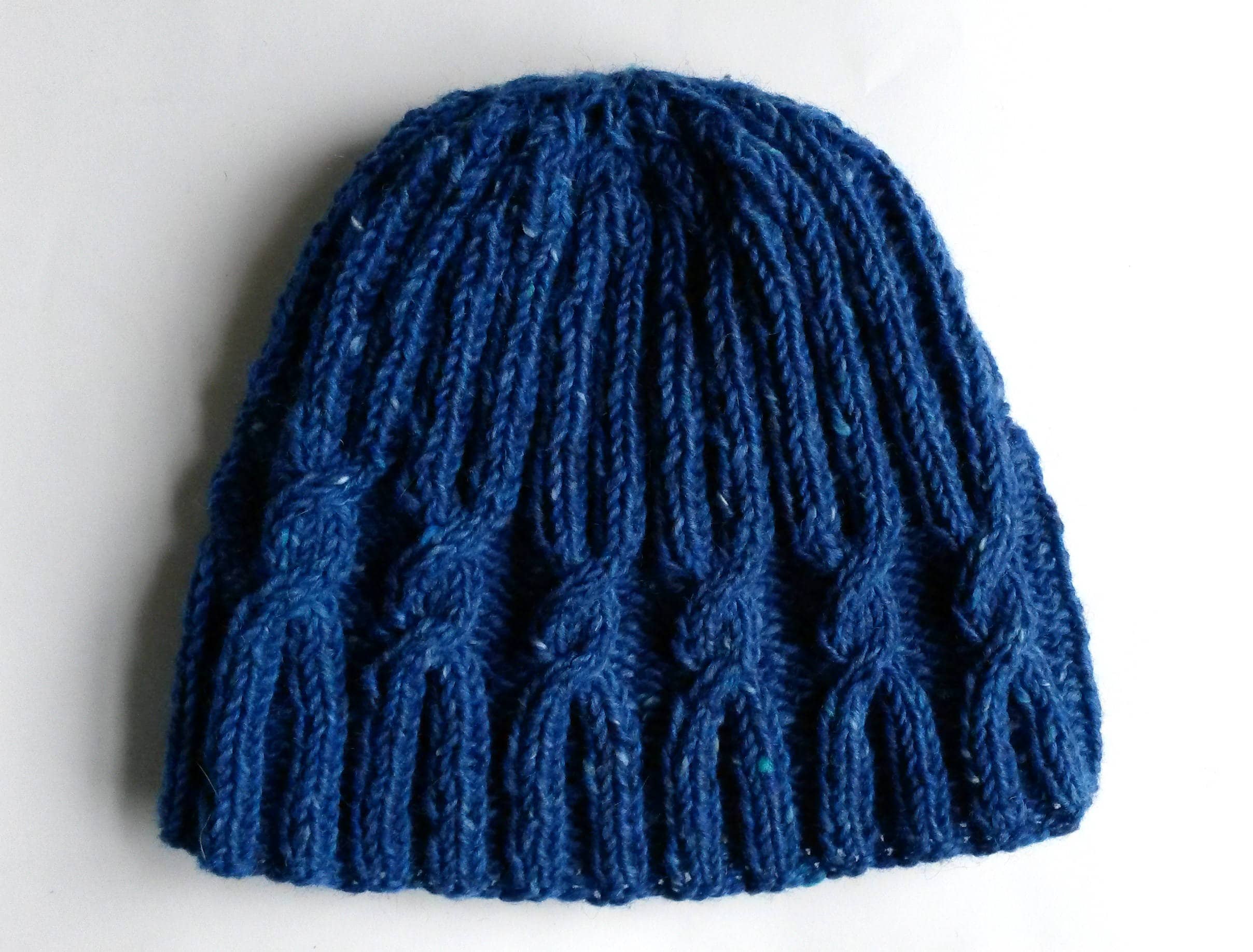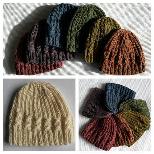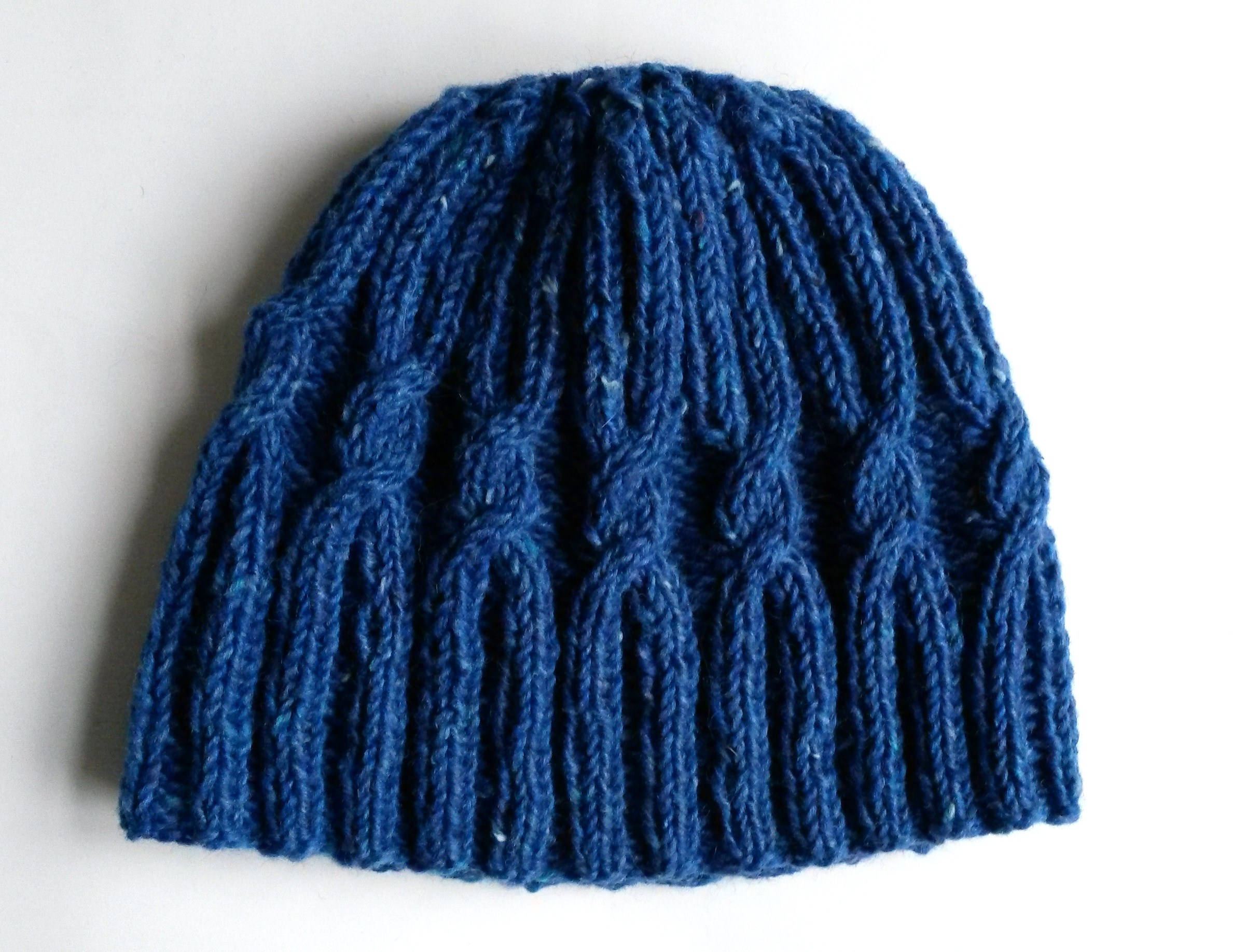 Man's knit beanie: original design with cable detail. This is my new hat design: the cable detail starts slightly higher on each column, a subtle spiral detail which you can see in the first and second photos above showing the back and front of the hat. It makes it a little different from standard hats, while still being a very wearable twist on a standard Aran motif.