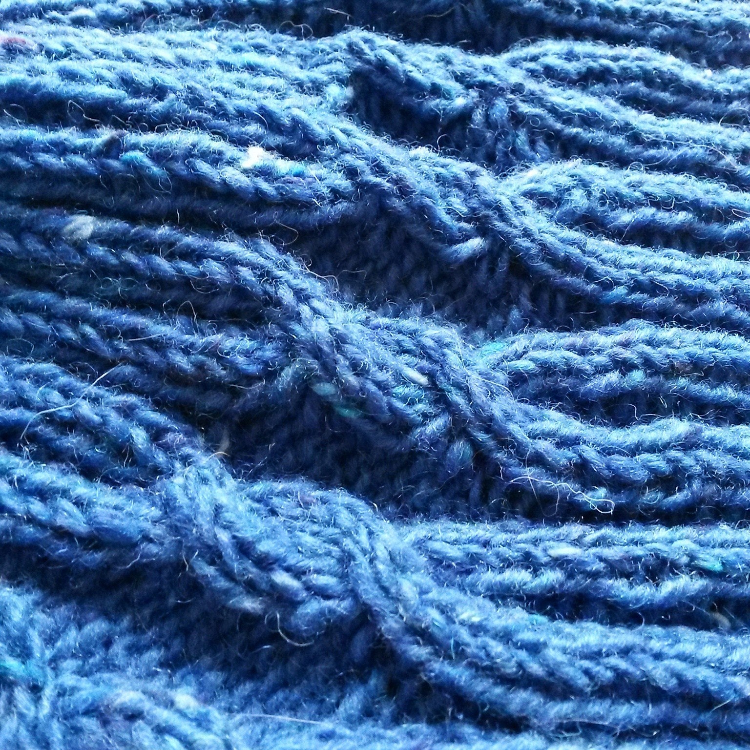 The wool used is a fantastic Irish yarn, Studio Donegal yarn, which is spun in Co. Donegal and has little tweed flecks in it. The yarn used to be known as Kilcarra Aran Tweed, and is a real Irish classic yarn.
