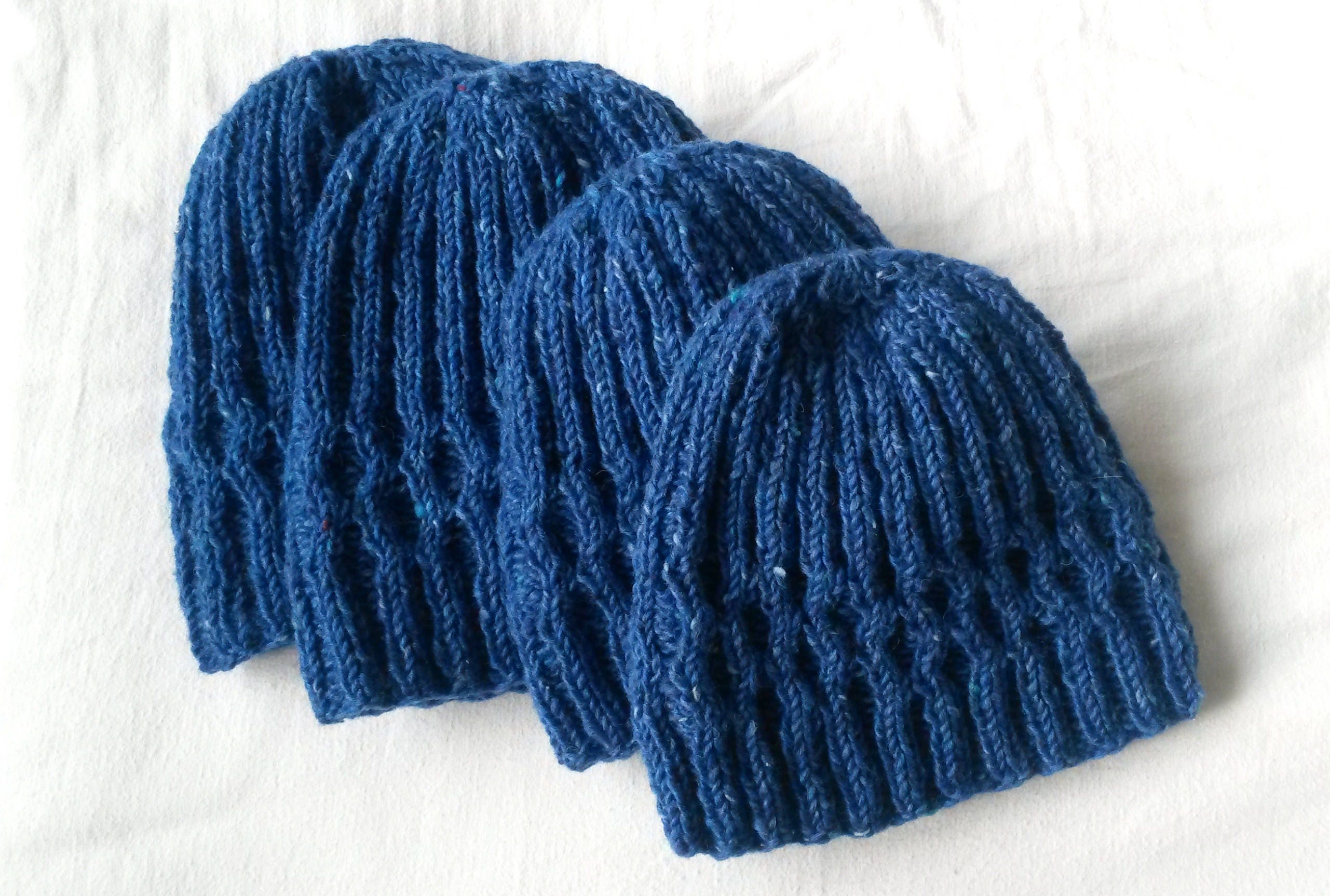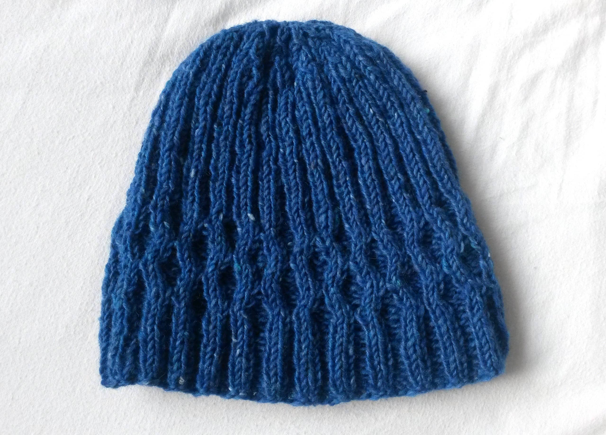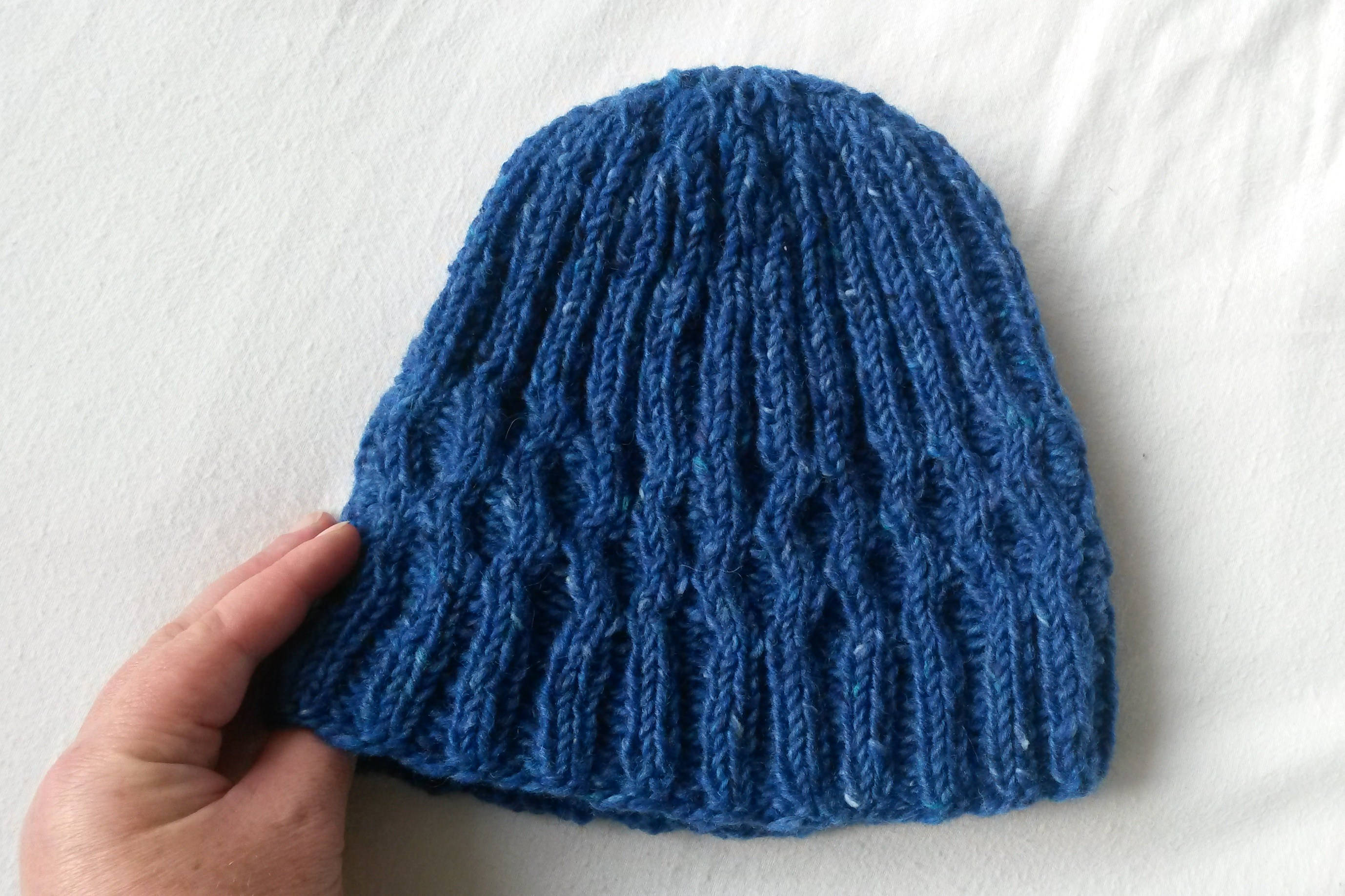 Knit wool beanie: These lovely wool hats are handknit (by me!) from beautiful Irish wool by Studio Donegal. The blue yarn has subtle tweed flecks throughout in complementary colours. The design is my own original creation; taking an Aran motif and adapting it to suit a more modern, pared-back style. The style is very comfortable to wear; the ribbing allows for stretch without over-looseness. The hat is seamless, having been knit in the round, and is super soft and comfortable to wear!