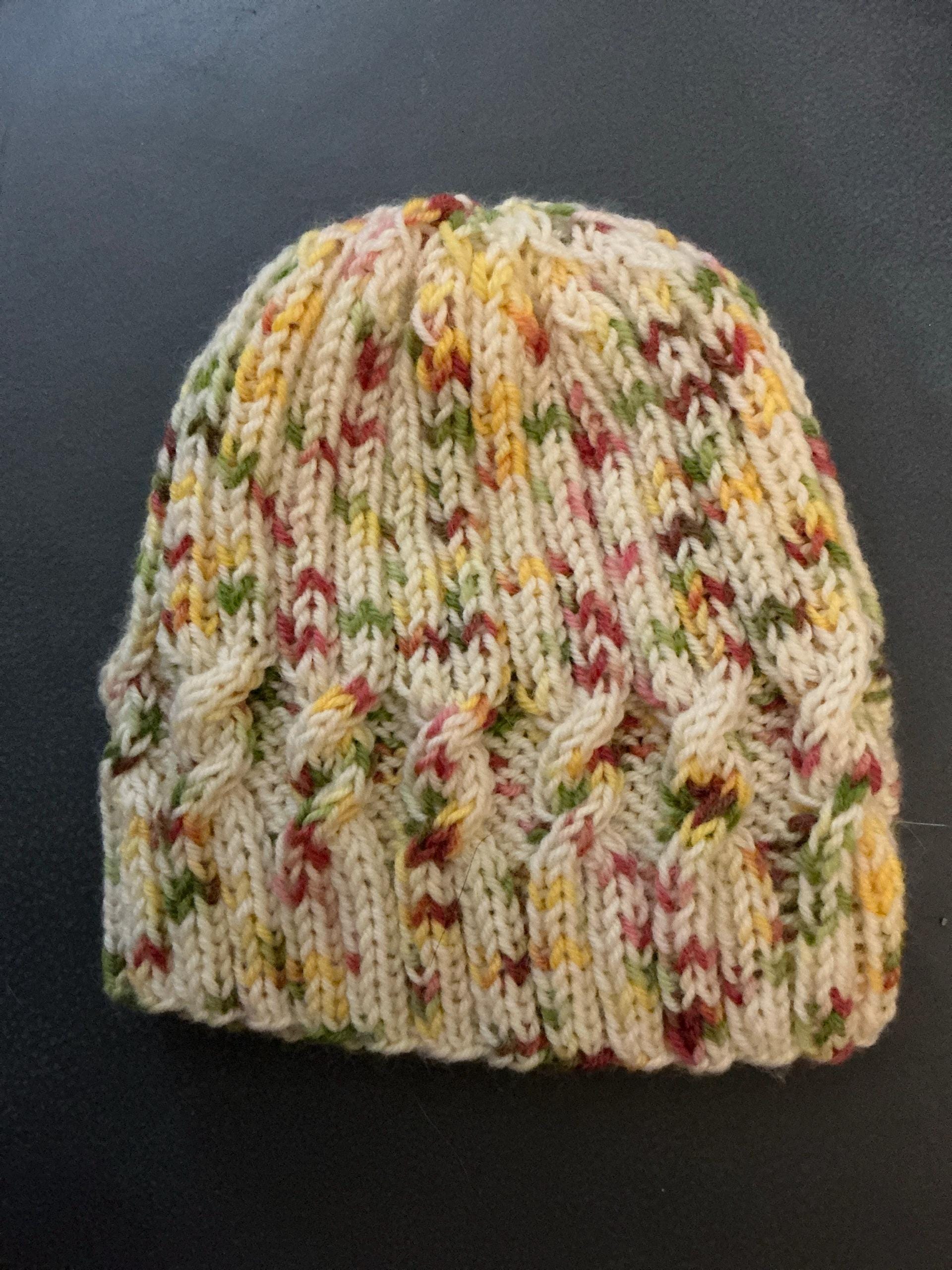 The hat is very forgiving in size, since the ribbing gives it some comfortable stretch; and the length can be adjusted between finishing the cable detail and starting the crown decreases.