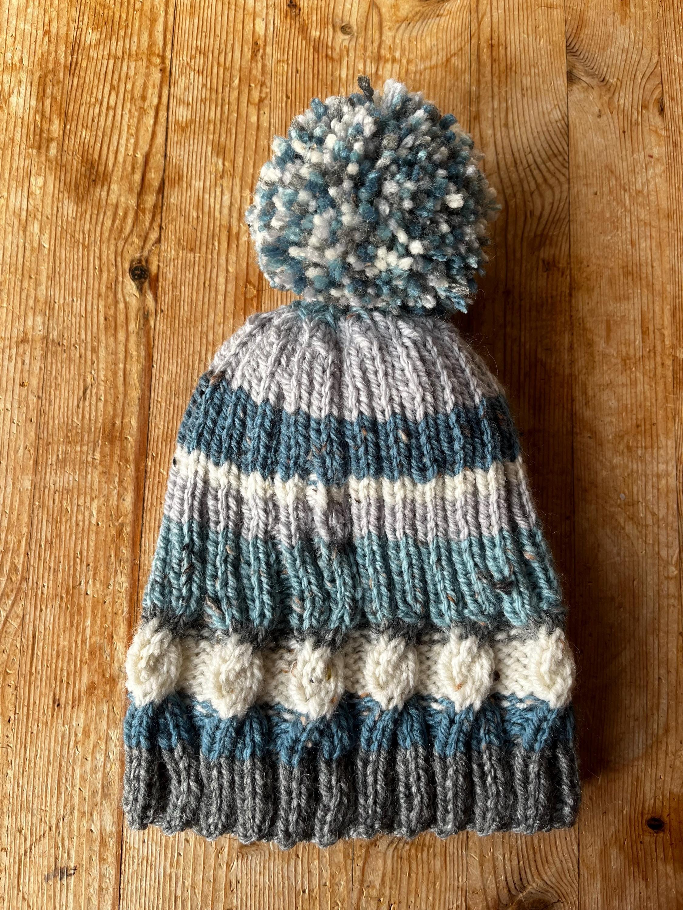 Any Aran yarn should be suitable for this pattern, 5 mm needles/US8 are recommended, but there is some leeway given that Aran yarns can vary a little in thickness. I would suggest being guided by the needle size recommended for the Aran yarn you are using. One 100g skein should be just enough for one hat. You might knit this hat from one skein, depending on its yardage. (e.g. the self-striping hats pictured were each knit from one 50g skein of Adriafil Zebrino yarn, but this has a generous yardage of 125m compared to many 50g skeins). I would suggest a requirement of 100 metres/110 yards of yarn.