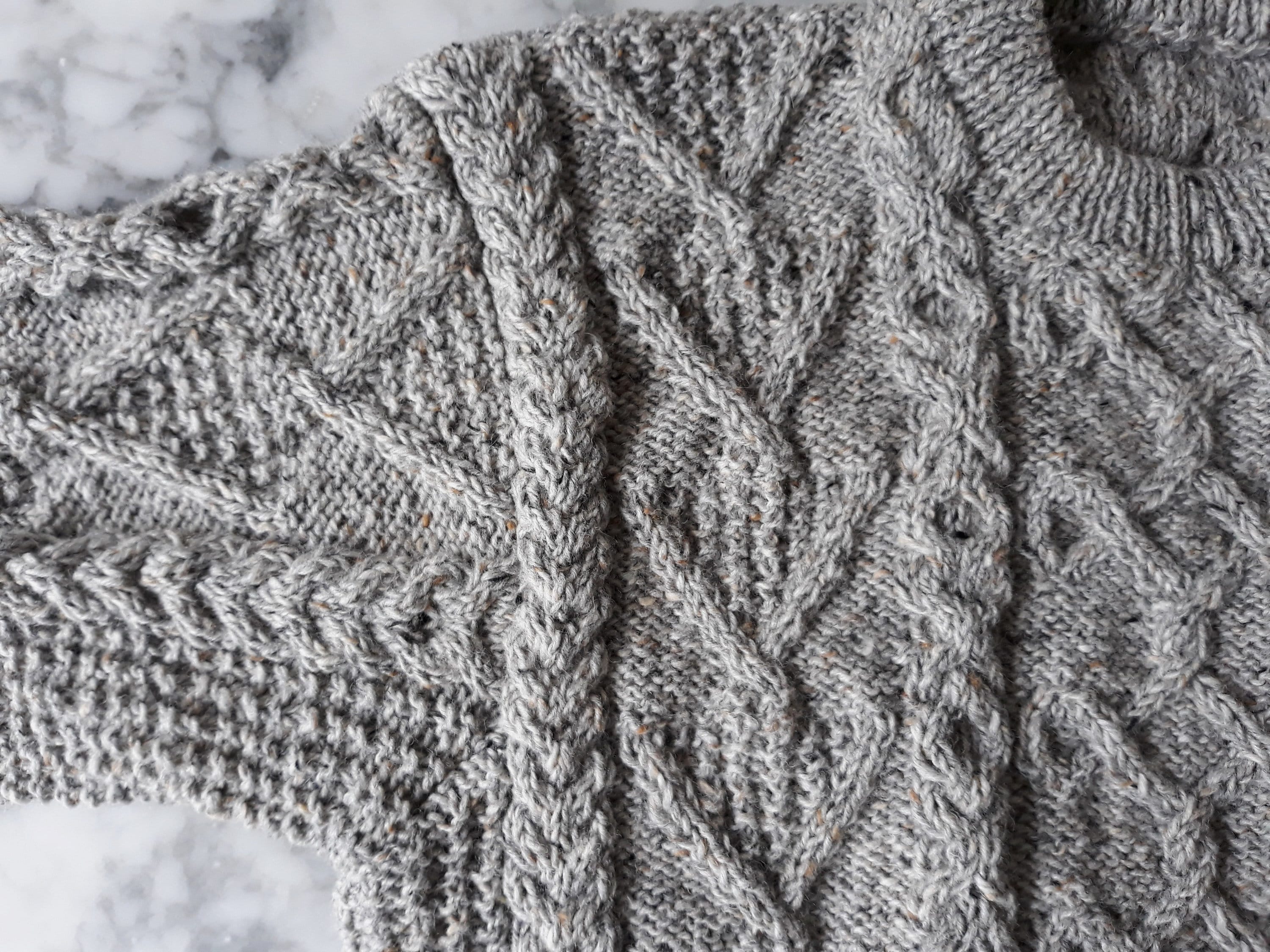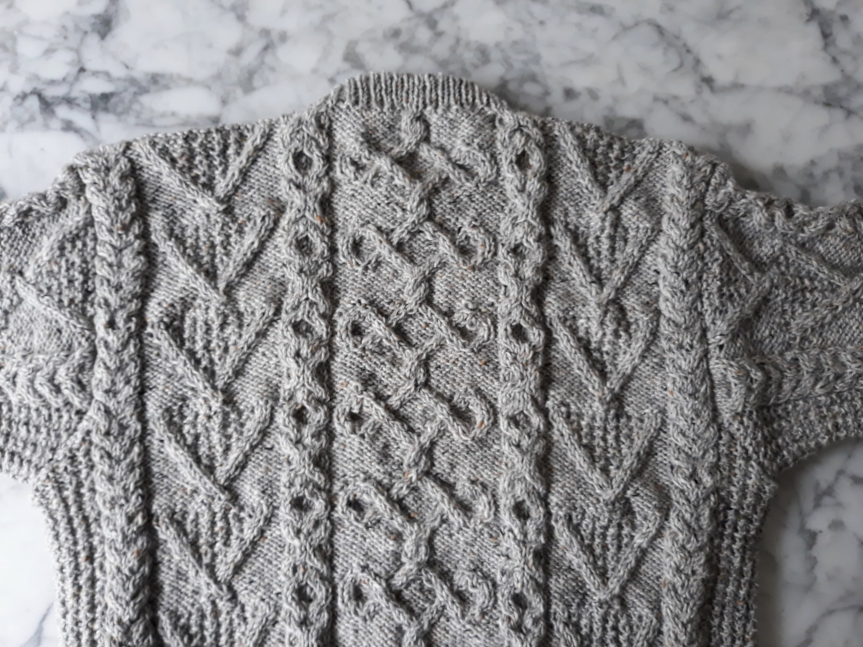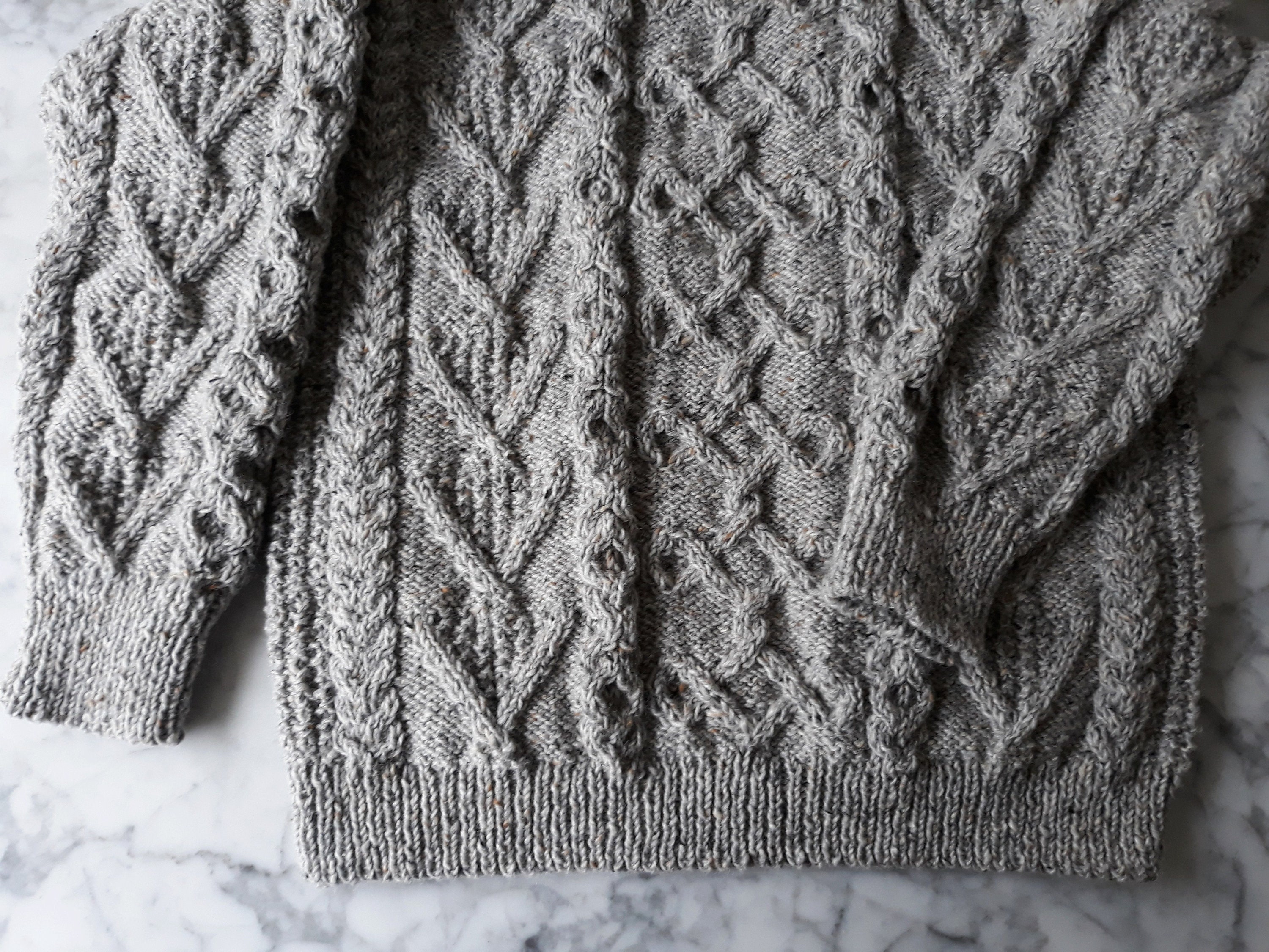 This sweater has a unique design, as each jumper she creates is a one of a kind item. It is knit in Studio Donegal Aran Tweed pure wool, which is wonderfully warm and hardwearing. It is a classic style of Aran, timeless and enduring. The grey colour is a classic neutral, working equally well with casual and smart casual clothes.